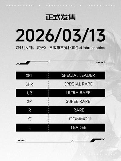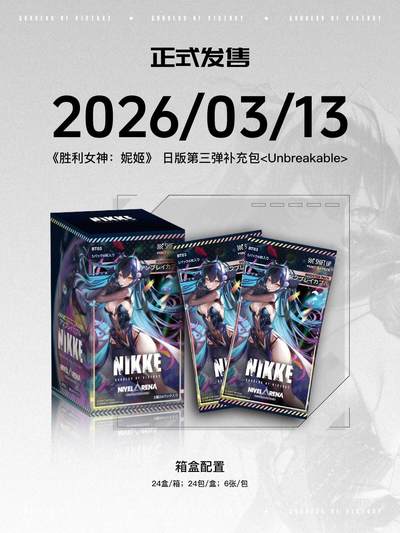 妮姬指挥官📢第三弹补充包「坚不可摧」定档 👋 各位指挥官,久等了! 《胜利女神:妮姬》日版TCG 第三弹补充包 —— 坚不可摧,发售日正式确定!📅 🛡️ 【弹名】 坚不可摧 📅 【发售日】 3月13日(本周五) 全新的卡牌、更坚固的阵容等你来构筑!无论是收藏还是对战,这一弹都值得期待!✨