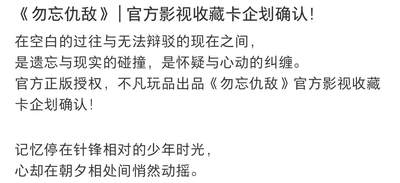 《勿忘仇敌》 | 官方影视收藏卡企划确认! 在空白的过往与无法辩驳的现在之间, 是遗忘与现实的碰撞,是怀疑与心动的纠缠。 官方正版授权,不凡玩品出品《勿忘仇敌》官方影视收藏卡企划确认! 记忆停在针锋相对的少年时光, 心却在朝夕相处间悄然动摇。 更多产品情报与精美实拍图,敬请持续关注, #不凡衍生品 #韩剧勿忘仇敌 #NeverForgetYourEnemy #李在恩jawoon #黄俊秀Junsu