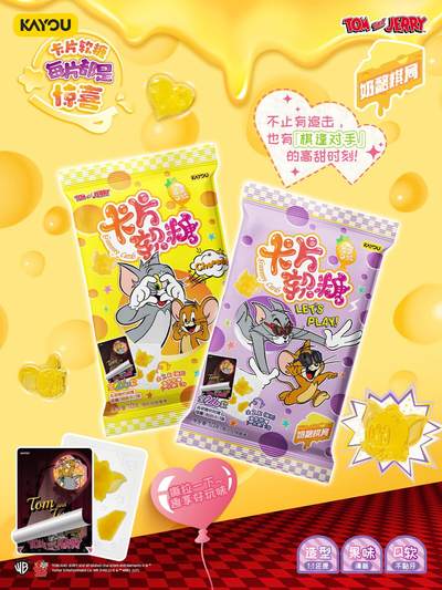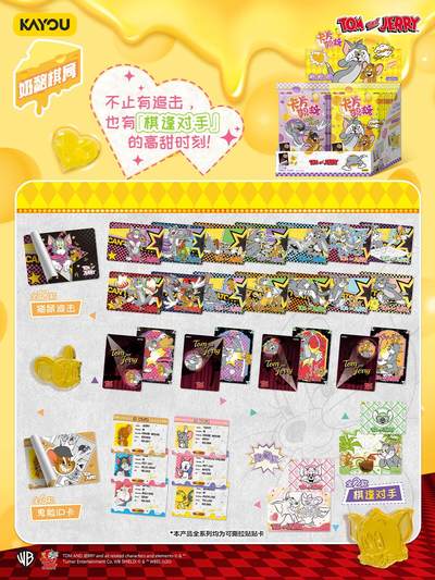 Tom and Jerry奶酪棋局系列卡片软糖(菠萝口味) 即将上线卡游卡游抽卡机&卡游APP! 🍍超萌猫鼠大头造型软糖,金色菠萝口味酸甜适中,食欲满满~ 😋全系列26款可撕贴贴卡,揭开贴面,陷入奶酪棋局的猫和老鼠精彩瞬间即将拉开帷幕!