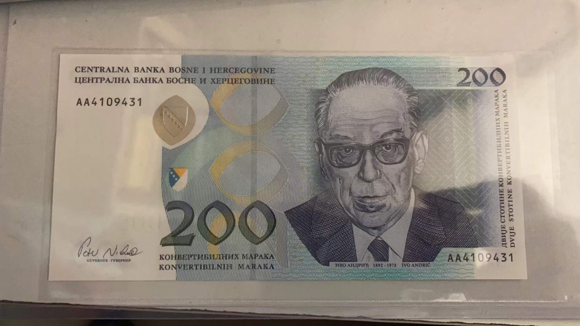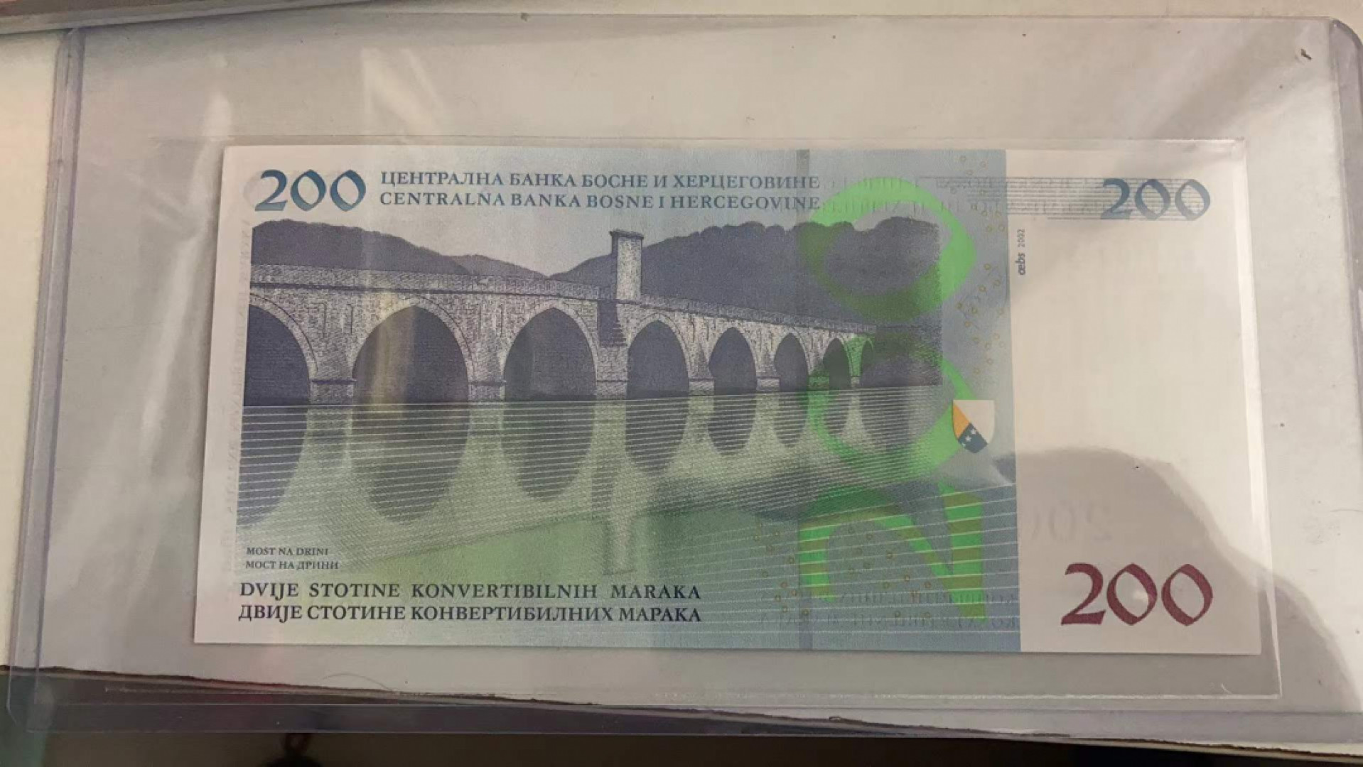 波黑200马克 非常经典的一张纸币 正面人物是南斯拉夫作家伊沃·安德里奇 Ivo Andric1892-1975,1961年诺贝尔文学奖的获得者,集诺贝尔奖纸币不可或缺;反面是波黑的维谢格拉德的默罕默德·巴夏·索科罗维奇大桥,默罕默德·巴夏·索科罗维奇大桥位于波黑城市维谢格拉德附近的德里那河上,这座石桥以1505年诞生于维舍格勒的奥斯曼帝国大臣穆罕默德·巴夏·索科罗维奇为名。始建于1566年,建成于1571年,当时的波黑正处于奥斯曼帝国统治之下,而该桥则是连接位于目前萨拉热窝的奥斯曼帝国分部和土耳其帝国在巴尔干地区控制的其他城市的交通要道。大桥共有11座石造桥墩,间隔11至15米,整座大桥长179.5米,象征奥斯曼土耳其帝国纪念性建筑和土木工程的最高峰。该大桥2007年被列入世界文化遗产。