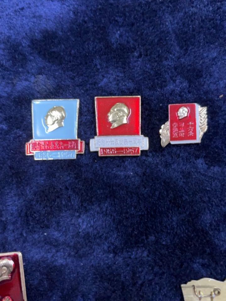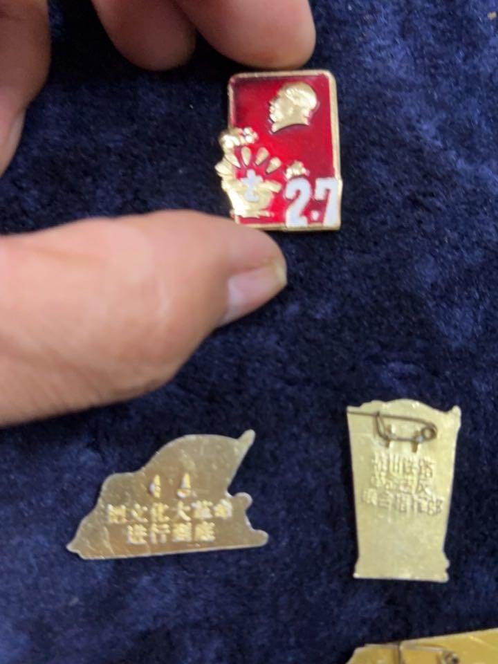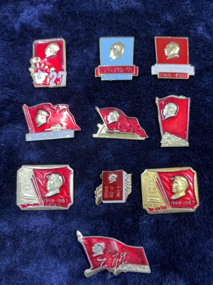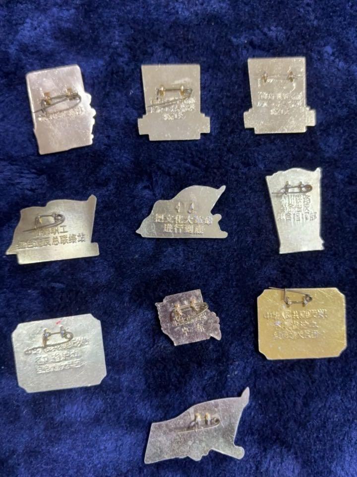 特稀缺异形小章名誉品,16条三枚,杭钢27纪念章一枚,广州4.18工联章一枚,上海各部位红色造反章两枚,首都职工红色造反总联络一枚,把文化大革命进行到底一枚,,杭州铁路革命造反联合指挥部一枚,共10不同图案一组9-10品一起出400元,