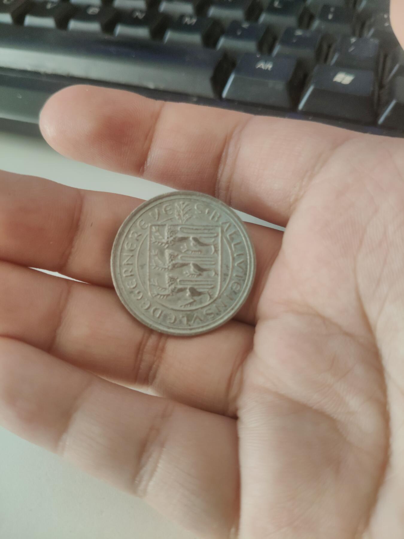 这个硬币是英属根西岛(Guernsey)的流通硬币,核心信息如下: 1. 身份与图案 它属于英国海峡群岛的根西岛货币,硬币上的三头狮子盾形纹章是根西岛的官方徽章(源自英格兰王室纹章,象征其与英国的历史关联)。 2. 铭文含义 硬币边缘的拉丁铭文“CIVIBUS SVIS BALLIVIS INSULAE DVCRENCREVE”(实际是根西岛的官方格言变体),大意是“为其市民、岛区长官及领地”,体现了根西岛的自治属性。 这类硬币常见于根西岛的十进制货币(如5便士、10便士等),材质多为铜镍合金,是根西岛作为英国皇家属地的货币代表之一。