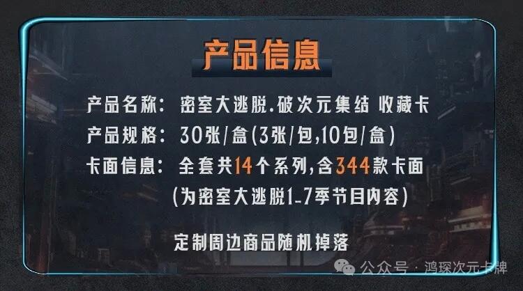 【正版授权】《密室大逃脱》破次元集结收藏卡【出品方】小芒&集卡社【产品爆点】✨《密室大逃脱1-7季》大混合✨艺人名单(排名不分先后):白举纲、陈赫、陈伟霆、陈哲远、大张伟、何炅、何与、黄明昊、黄宣、林一、刘昊然、马伯骞、彭昱畅、田嘉瑞、王楚然、王鹤棣、王嘉尔、魏大勋、文俊辉、吴谨言、吴宇恒、许凯、杨迪、杨幂、余承恩、张国伟、张若昀、张宥浩、张雨剑、周笔畅等✨340+款卡面设计,收录密逃至臻卡、密逃巅峰卡等卡款!【产品规格】💰3张/包,10包/盒,36盒/箱零售控价:159元/盒⏰拟上市时间:2025年12月6日中午12点#限量500箱#首批订购福利:订5箱,高概率6编/10编出1;订10箱,高概率6/10编出3。