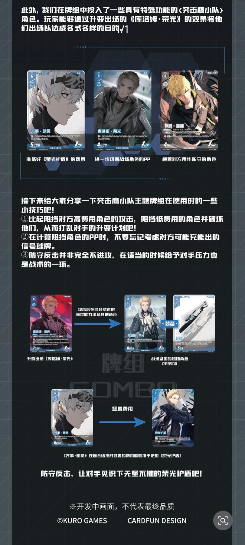 作为空中花园执行者部队的精锐斥候小队,【突击鹰小队】牌组完美复刻构造体全员作战的核心设定。队长库洛姆的特化逆元装置卡牌提供指挥增益,神威的重剑突袭、万事的精准侦察与卡穆的狂暴输出形成多元战术体系。