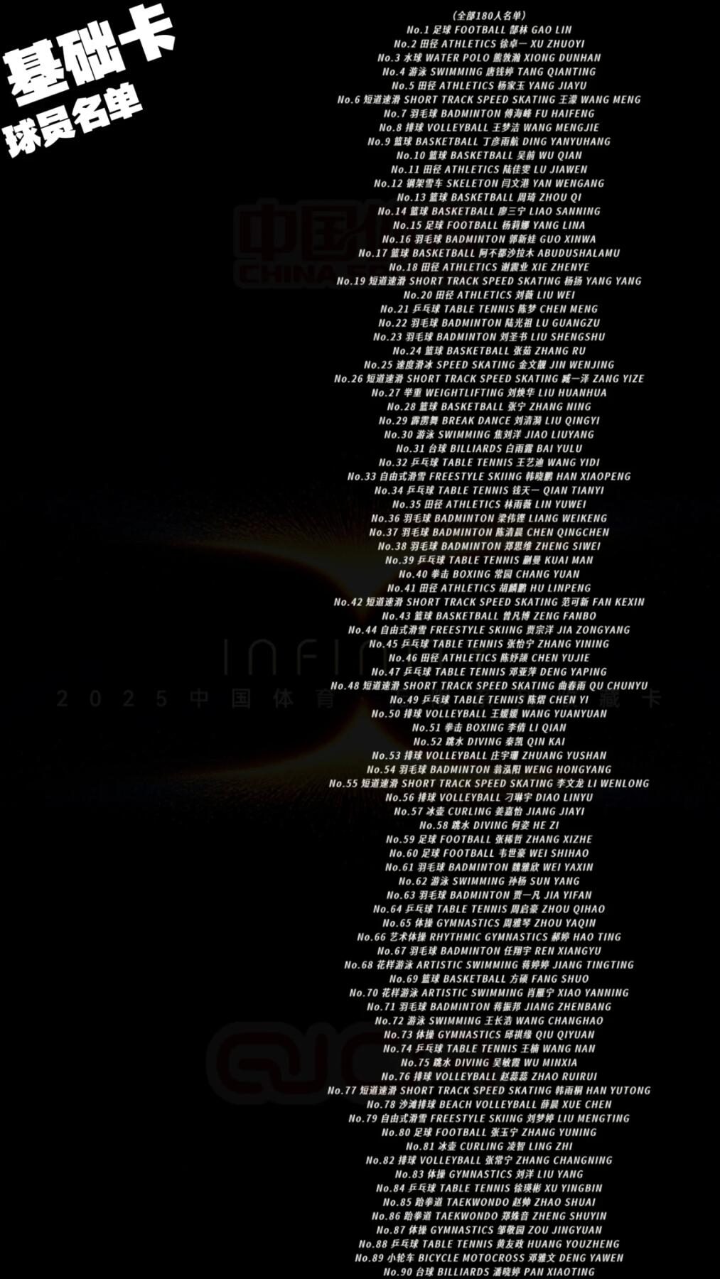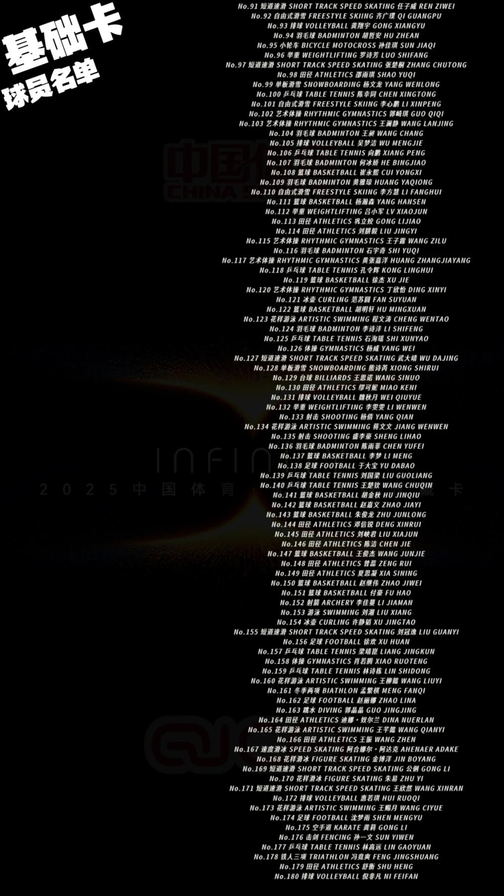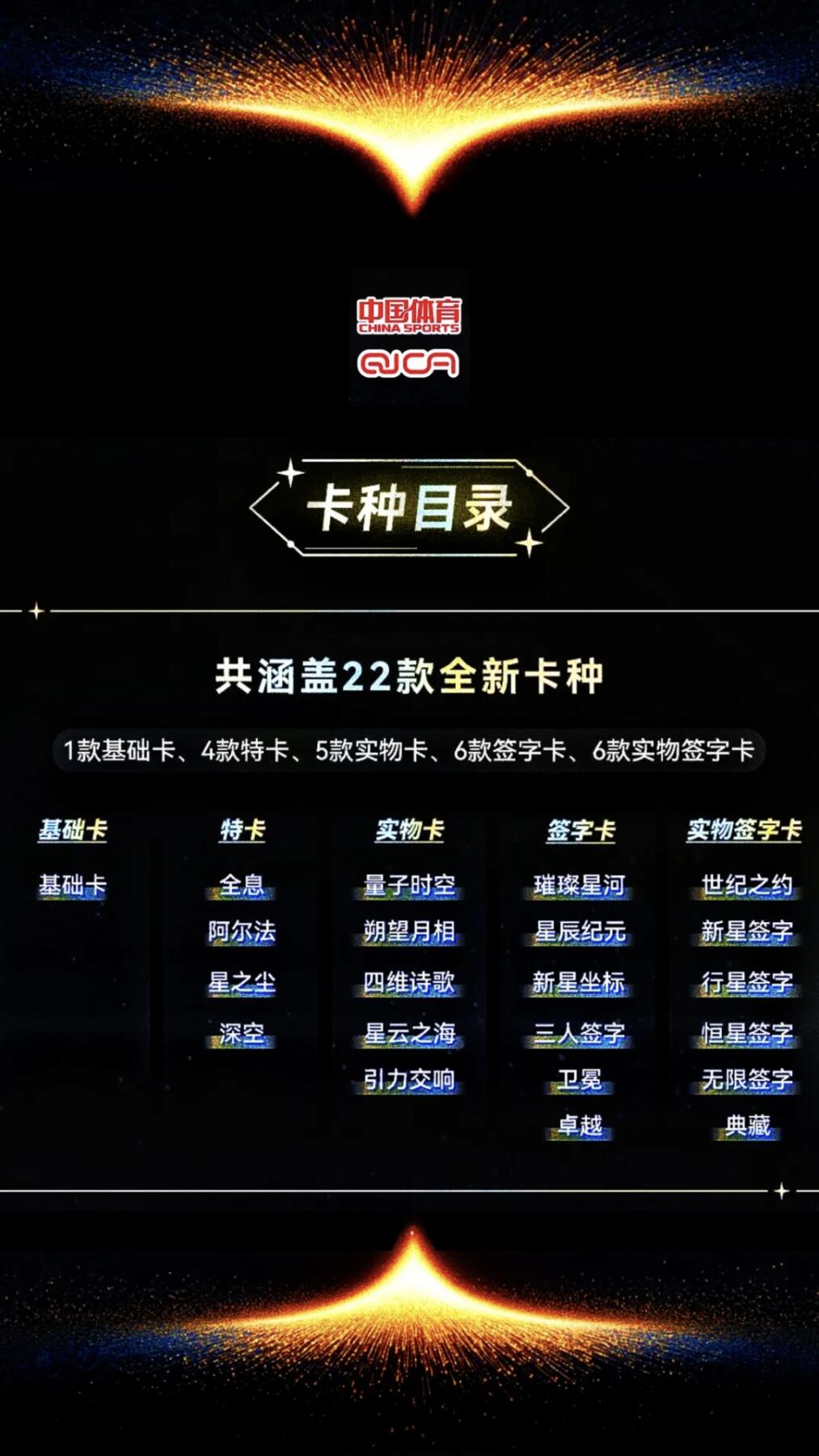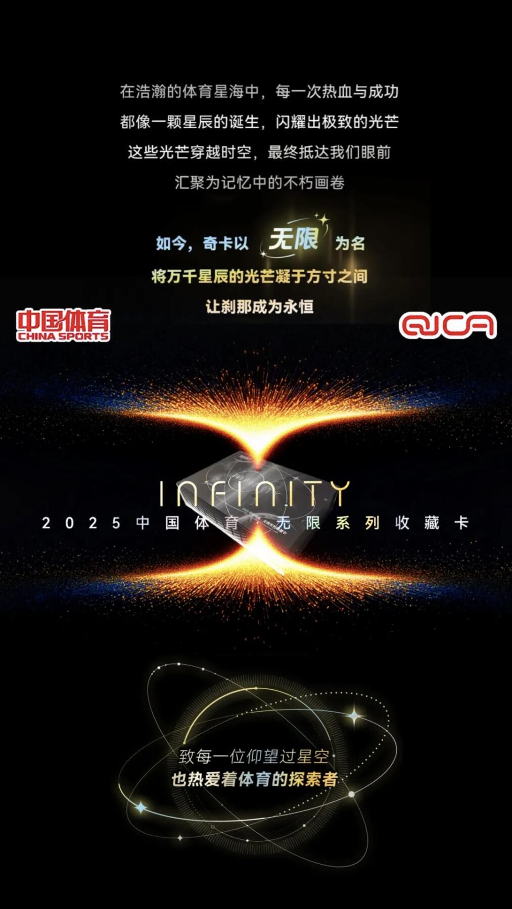 10月18日,奇卡QICA重磅推出《中国体育无限系列》收藏卡牌,以“浩瀚星河见证体育荣耀”为核心,打造国产体育收藏卡高端标杆。全套卡牌打破传统中国风束缚,采用欧式激进设计风格,收录200+位中国体育健儿,涵盖乒乓球、田径、跳水、篮球等多个热门项目,既有郭晶晶、张怡宁等传奇名将,也有杨瀚森、夏思凝等新生代新星。