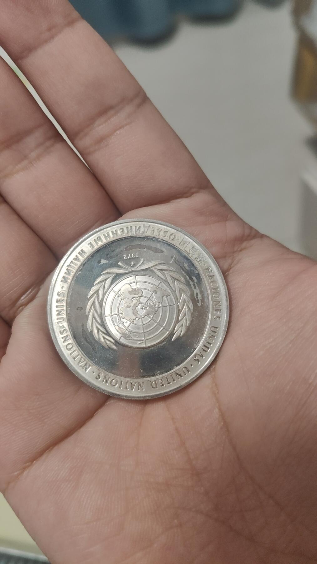 系列:富兰克林铸币厂-联合国奖章 正面 脚本:拉丁语 字体: 一个世界 团结一致 谅解 雕刻师: 诺曼·内梅特 反面的 联合国印章,日期如下 脚本:拉丁语 字体: 联合国联合国объединенныенации联合国∙ 调频 1972 薄荷 (调频) 富兰克林铸币厂(富兰克林铸币厂),美国宾夕法尼亚州瓦瓦(1964-2003年) 评论 这些奖牌以5枚为一套,以不同的语言发行: 1)中文、2)俄语、3)英语、4)法语和5)西班牙语
