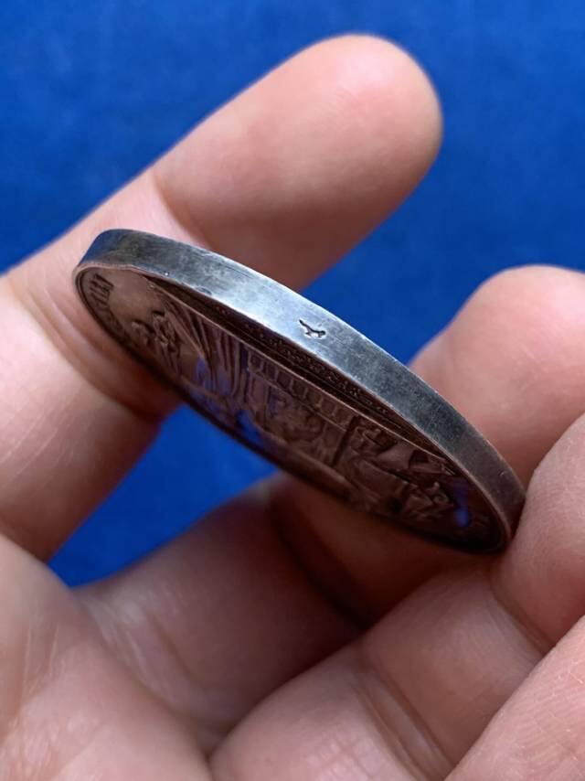 五彩的法国1854年银婚纪念章 银质,重约22.25克,直径约36.4mm 正面一对新人在女神的见证下,喜结连理,背面花环边饰,底部刻有“手指ARGENT”(手指即1845年至1860年铸造) 新人结婚年份“1854年”,背面有花体字母,细节清晰,彩色老包浆,成色极为漂亮,收藏佳品