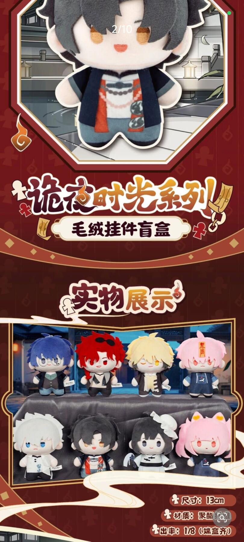 《时光代理人》的粉丝们有福啦!“诡夜时空”系列毛绒挂件即将让全员可爱登场。该系列挂件以动画中的诡夜时空为主题,将程小时、陆光、乔苓等主角团成员以及相关角色,以Q版毛绒形象呈现,每个挂件都精准捕捉了角色的特点,如程小时的俏皮、陆光的沉稳等,萌趣十足。