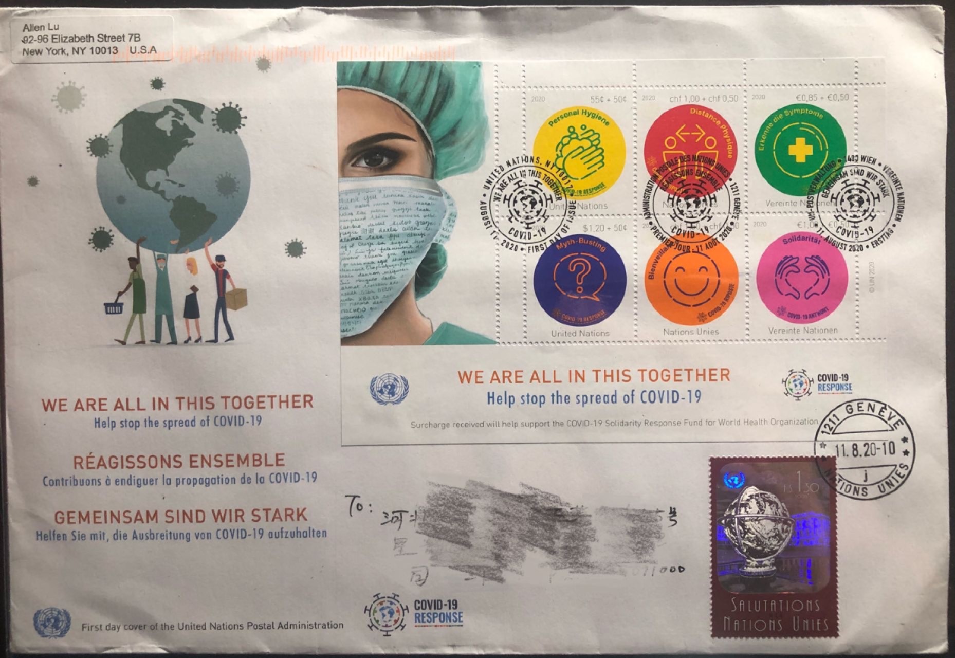 联合国抗疫全张首日日内瓦实寄中国