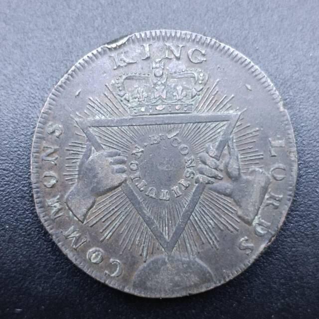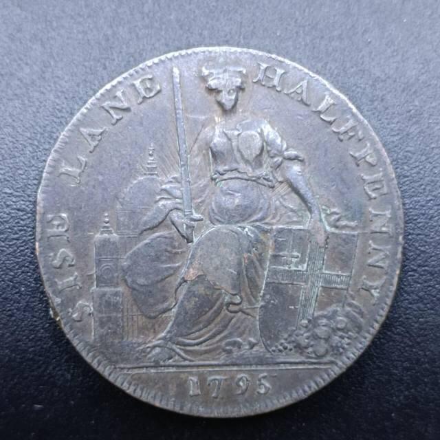 1795年英国半便士代币,- 正面图案为皇冠下的放射三角被双手托举,环刻“KING LORDS COMMONS”(国王、上议院、下议院),代表英国宪政体系。背面坐像为“都市女主人(Mistress of the Metropolis)”,背景是圣保罗大教堂,刻有“Sise Lane Halfpenny 1795”。