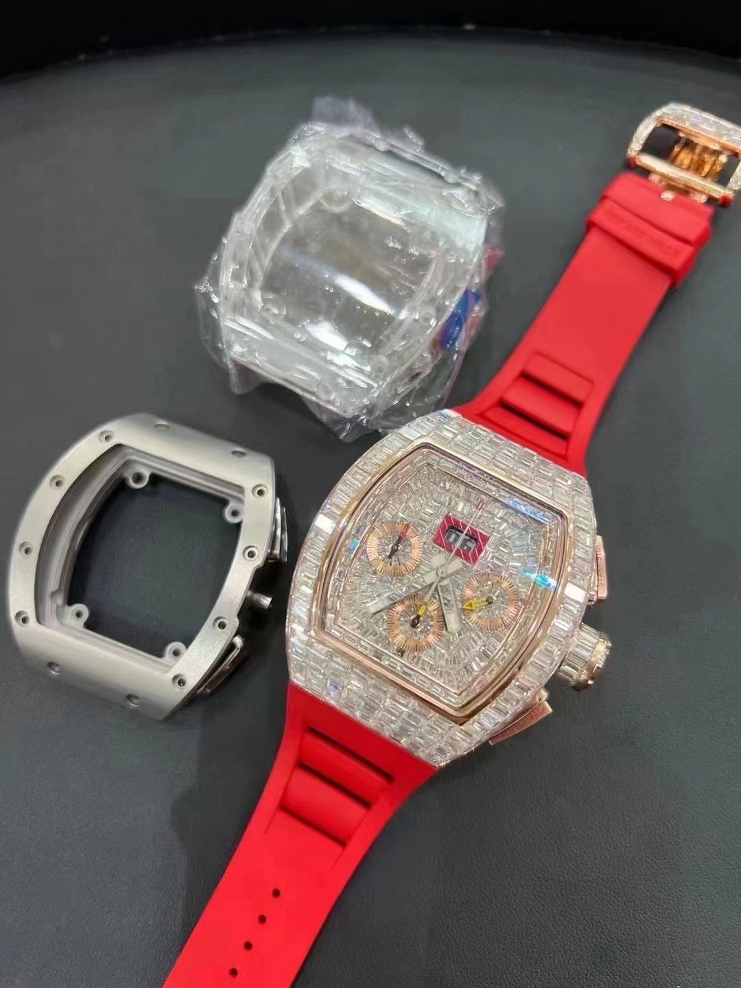 理查德米勒RM011后镶顶级T方钻,一套水晶壳,一套原装钛合金壳,一套顶级T方钻壳,一表三戴,极致奢华的理财产品
