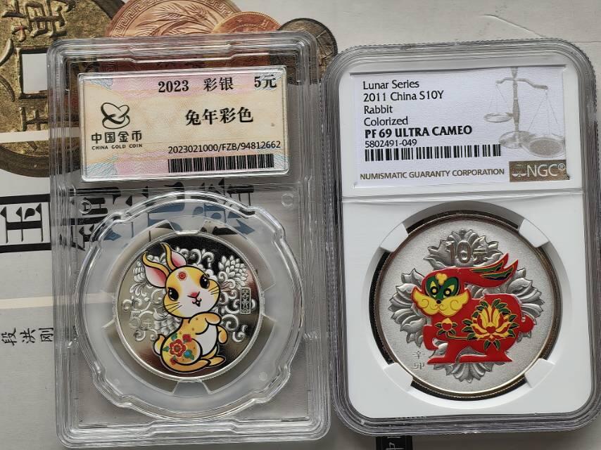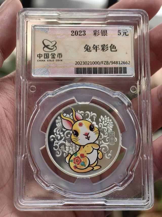 - 2023年癸卯兔年15克圆形银质纪念币 :是中国人民银行2022年11月18日发行的癸卯兔年金银纪念币中的一枚。该银币为精制币,含纯银15克,直径33毫米,面额5元,成色99.9%,最大发行量30万枚。背面图案为装饰兔造型,衬以吉祥纹饰,采用彩印工艺,线条简约圆润,色彩柔和丰富,整体形象活泼灵动