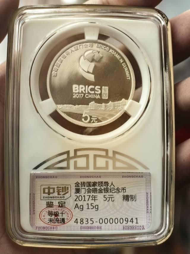 厦门金砖5元银币,即2017年8月28日央行发行的“金砖国家领导人厦门会晤15克圆形银质纪念币”,精制99.9%银,面额5元,发行量50000枚,属国际峰会题材法定纪念币 。