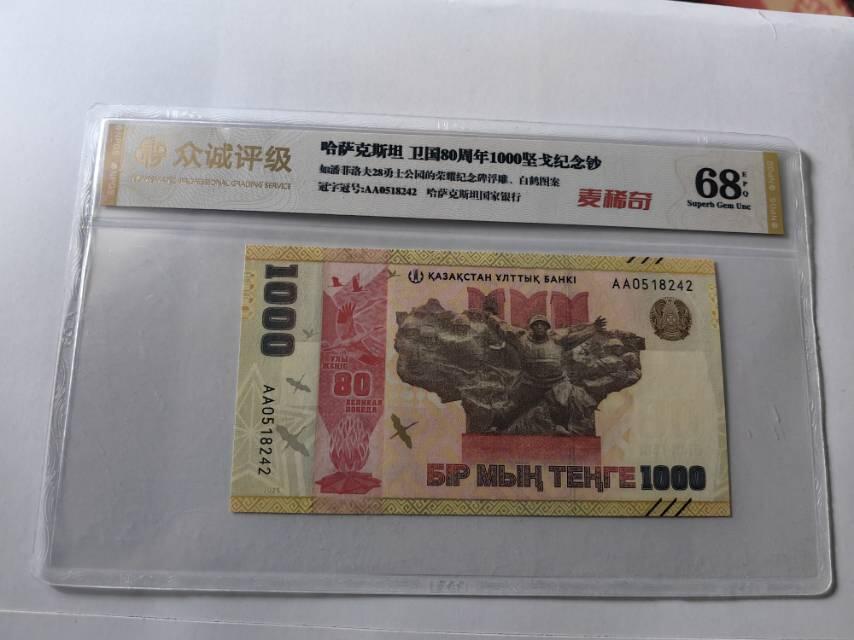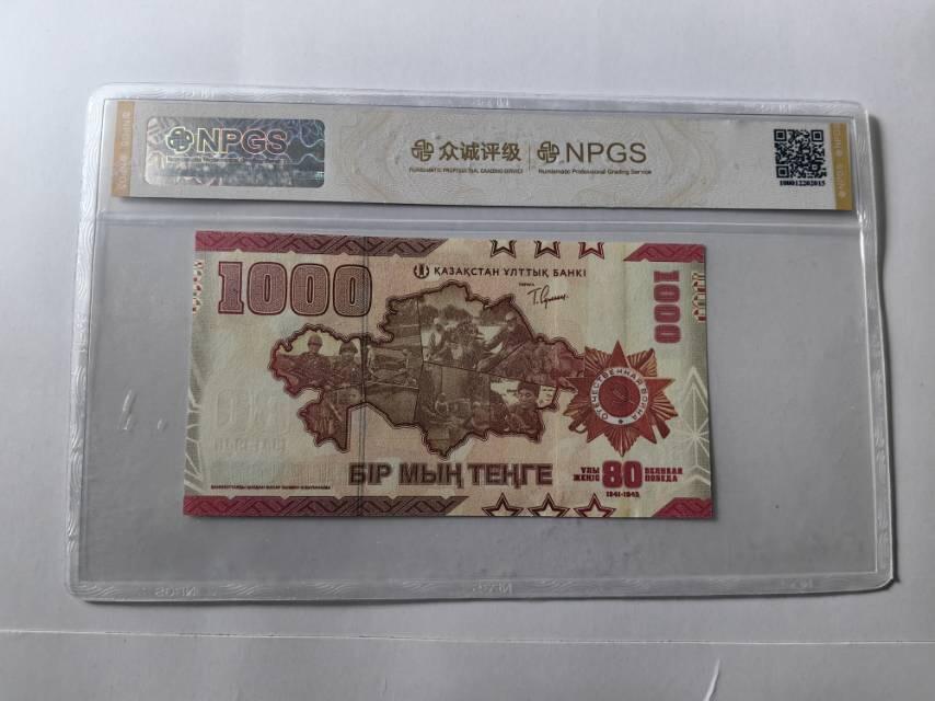 哈萨克斯坦发行过多种1000坚戈纪念钞,以下是两种常见的纪念钞介绍: 世界反法西斯战争胜利80周年纪念钞 - 发行时间:2025年5月9日。 - 发行量:500万张。 - 票面设计:主色调为棕黄色。正面描绘了位于以28名潘菲洛夫卫兵命名的公园内的“荣耀纪念碑”,还有微光学保护条,倾斜钞票时,条带呈现三维深度、体积及光泽效果,展现永恒之火与飞翔的仙鹤。背面以哈萨克斯坦地图为背景,融入历史档案照片片段,并配有卫国战争勋章图案。