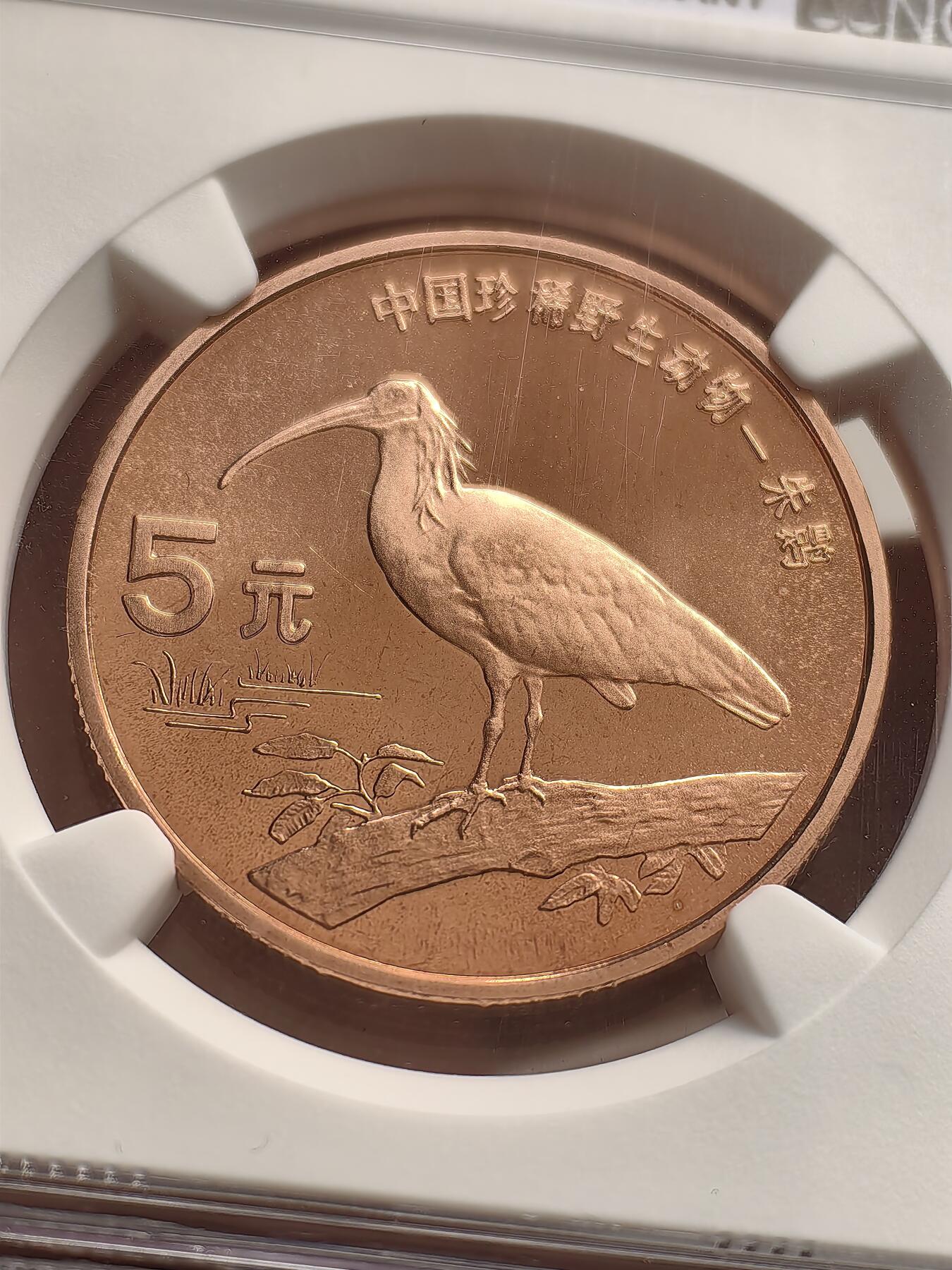 朱鹮5元精制铜币是1998年央行发行的中国珍稀野生动物系列精制普通纪念币,沈阳造币厂铸造,与同年普制币(发行量600万枚)并行,精制币装帧量仅2万套,更稀缺。