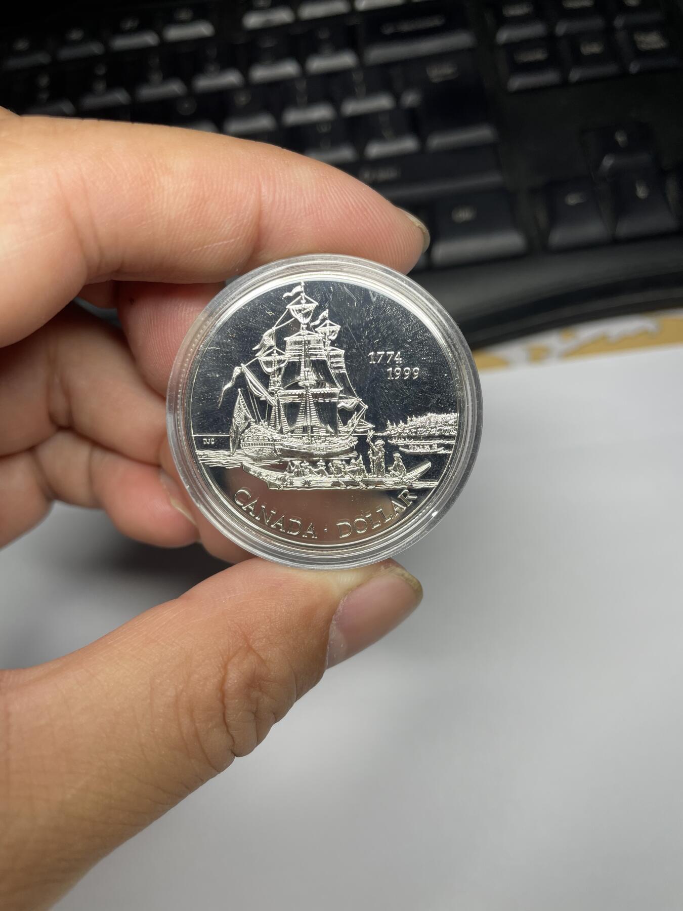 加拿大1999年发行的“邦蒂号”帆船纪念银币,面值1加元。
