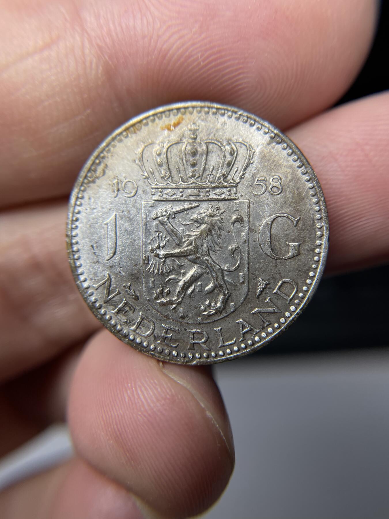 - 背面(图二):中心是荷兰国徽(头戴王冠的持剑雄狮盾徽),两侧标注面值“1 G”(1盾),上方年份为“1958”,下方刻有“NEDERLAND”(荷兰)字样,设计风格庄重且具有鲜明的国家辨识度。