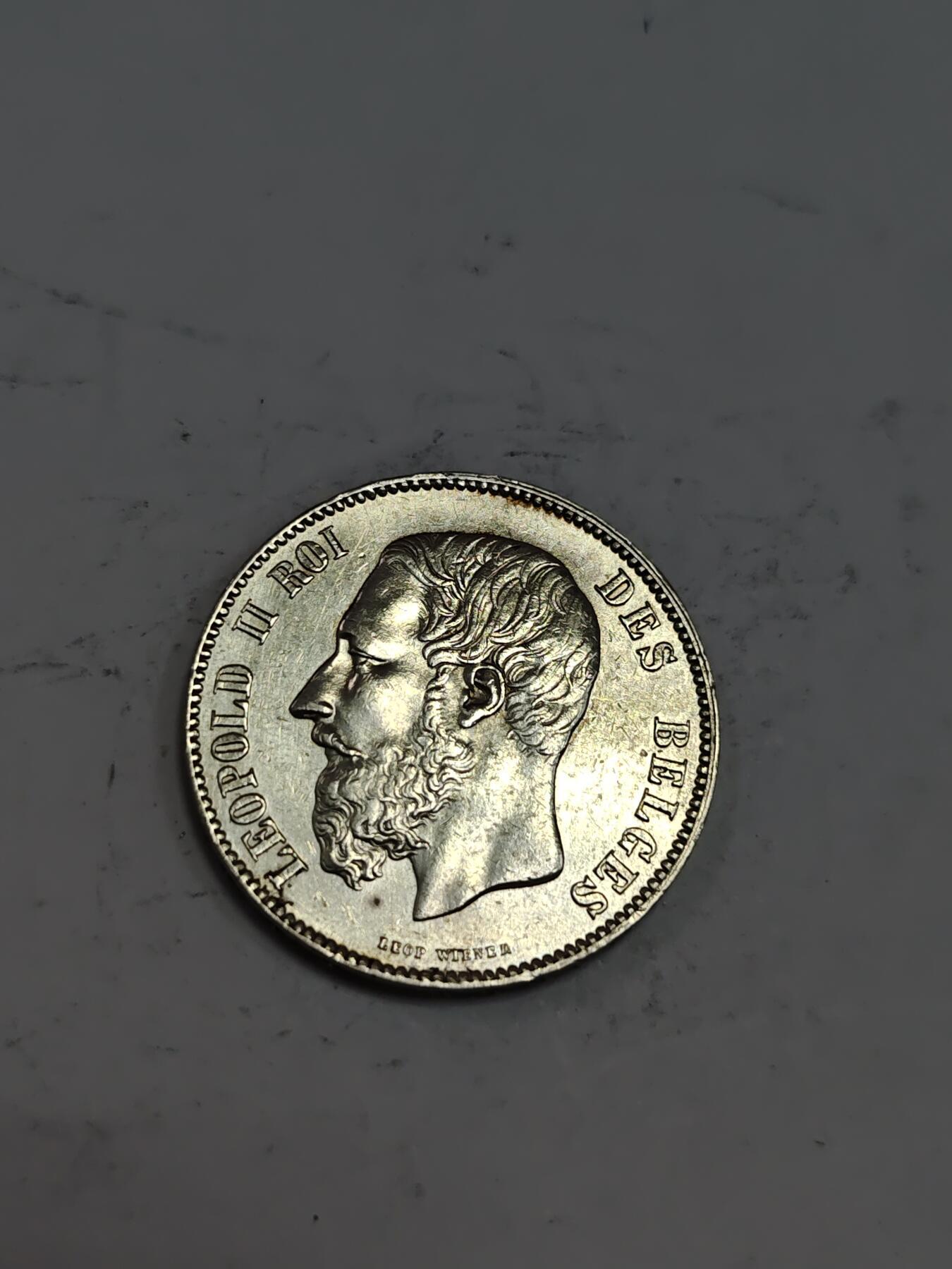 - 发行背景:该币发行于利奥波德二世国王(Leopold II)在位期间(1865-1909年),是比利时当时的主流通银币,采用法语版设计。