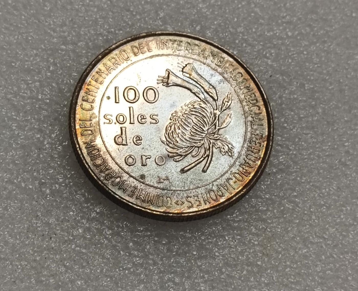 - 正面(菊花面):中心是日本皇室象征的菊花图案,环绕的西班牙语意为“秘鲁—日本商业往来百年纪念”,同时标注面值“100 soles de oro”。