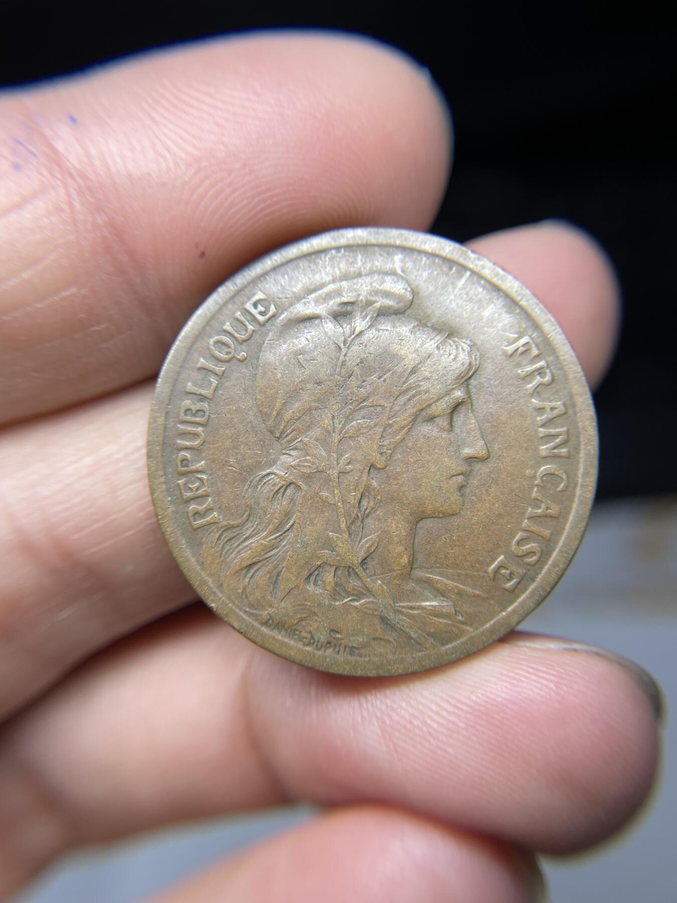 - 发行背景:这是法国第三共和国(1870-1940)的法定流通硬币,由著名雕刻师奥古斯特·迪普伊(Auguste Dupuis)设计,在一战期间大量铸造,是当时法国小额支付的核心币种。