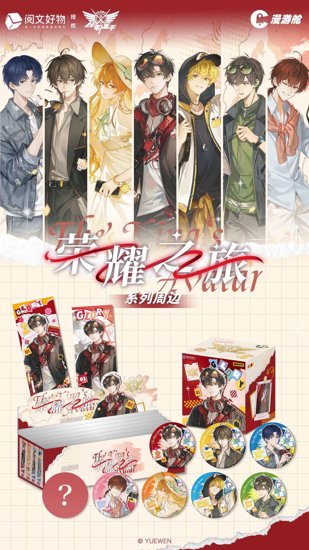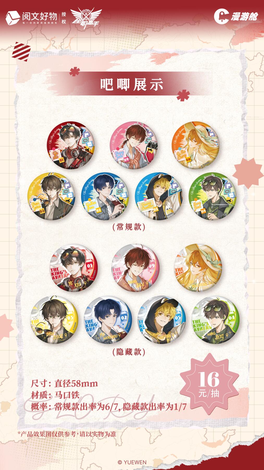 无论风雨,新的旅途都如期而至 由@阅文好物 官方授权,@漫游舱 出品 《全职高手》 荣耀之旅系列周边来啦! ————产品详情———— 【荣耀之旅系列马口铁徽章】 尺寸:直径58mm 售价:16元/抽,112元/盒 规格:1个/包,7包/盒 【荣耀之旅系列镭射票】 尺寸:70*210mm 售价:10元/抽,70元/盒 规格:1张/包,7包/盒