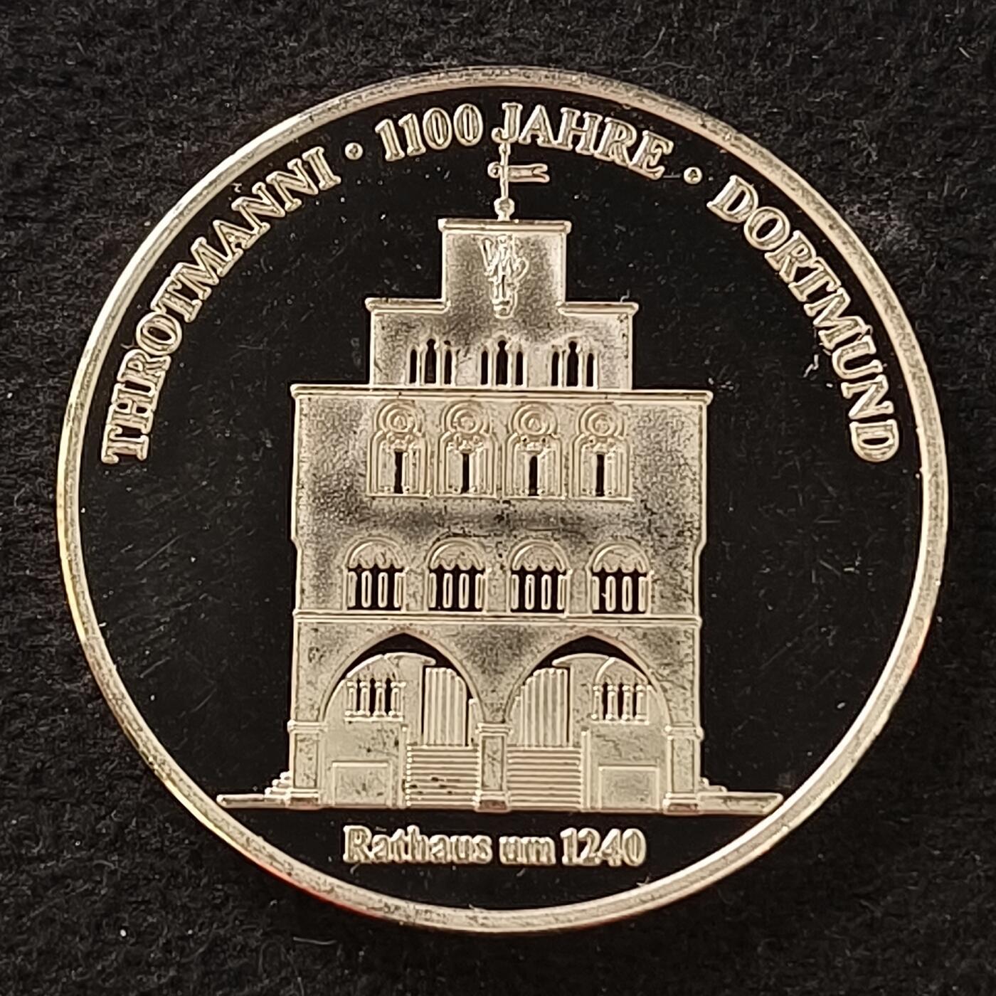 - 核心信息:这是为纪念德国多特蒙德(Dortmund)建城1100周年而发行的纪念银章。图案是多特蒙德1240年的老市政厅(Rathaus um 1240),边缘环绕“THROTMANNI · 1100 JAHRE · DORTMUND”,其中“Throtmanni”是多特蒙德的拉丁文古称。 - 背景:多特蒙德是德国鲁尔区的核心城市,这枚银章通过重现中世纪市政厅的样貌,致敬了这座城市悠久的历史与文化传承。