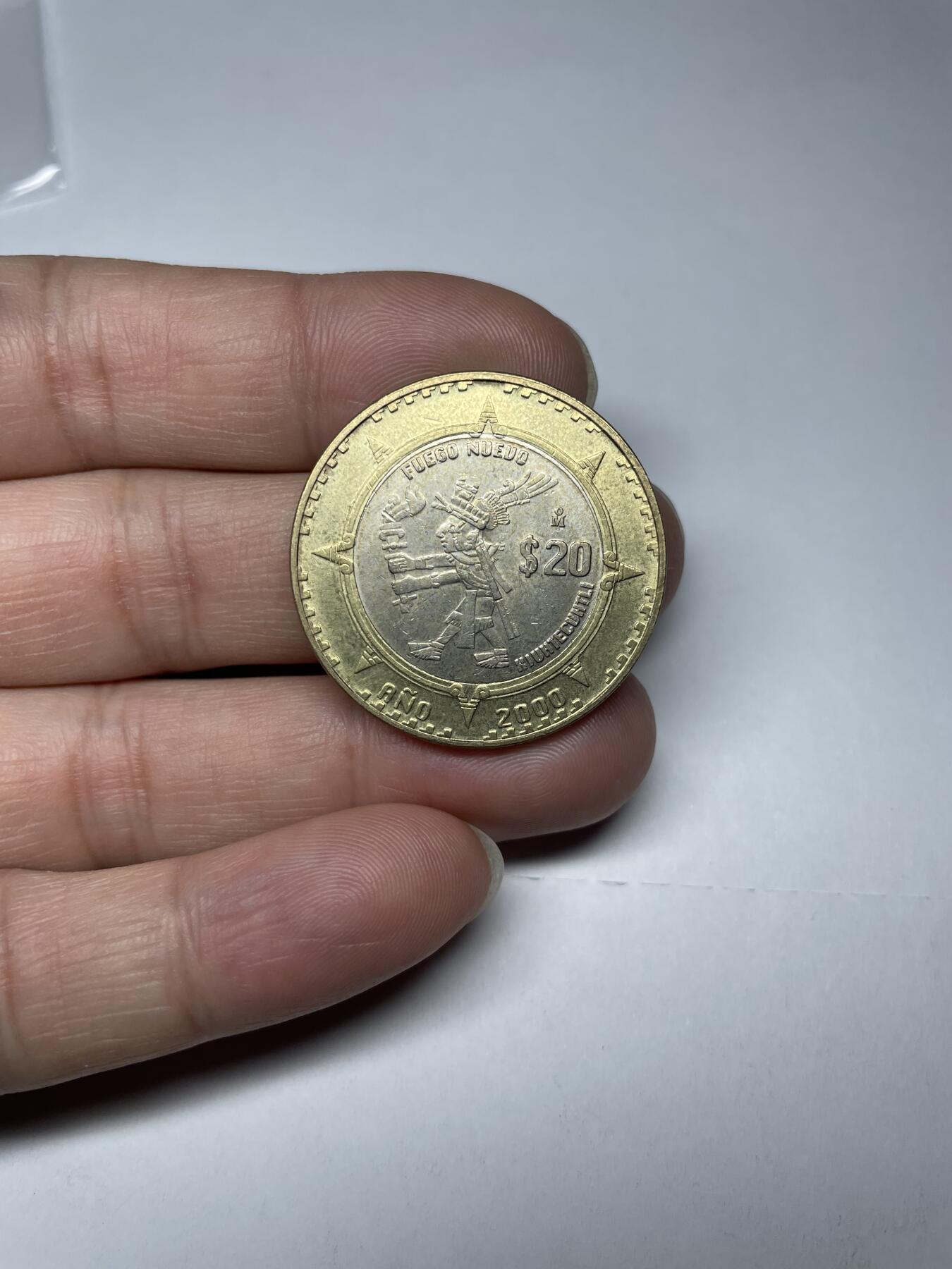 - 背面(图案面):描绘了阿兹特克神话中的火与智慧之神“休特库特利”(Xiuhtecuhtli),上方刻有“FUEGO NUEVO”(新火),下方标注了年份“2000”和面值“$20”。这是为了纪念玛雅历法中的“新火”仪式和千禧年。