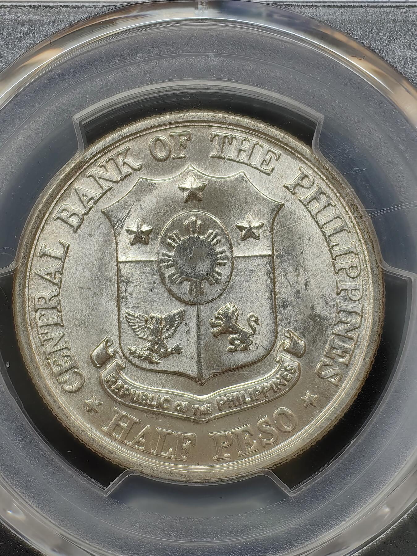 - 正面:菲律宾国徽盾形纹章,标注“HALF PESO / CENTRAL BANK OF THE PHILIPPINES”;