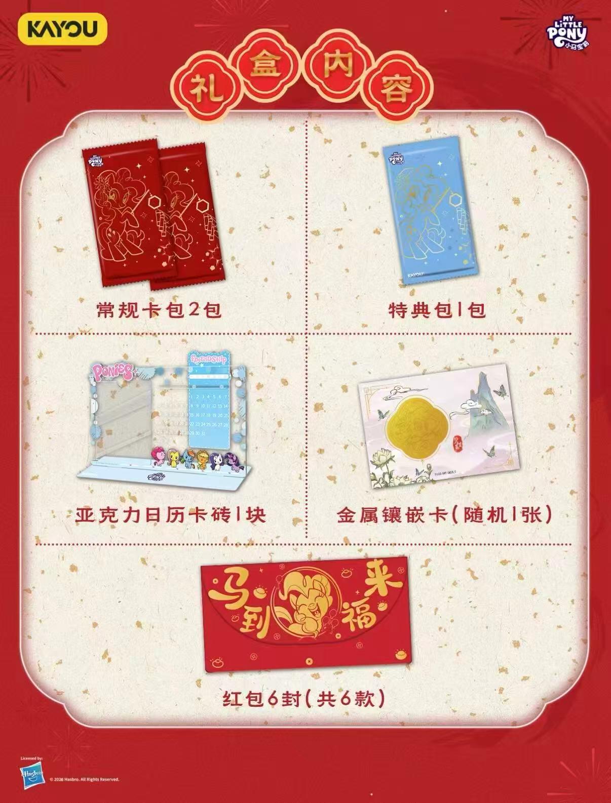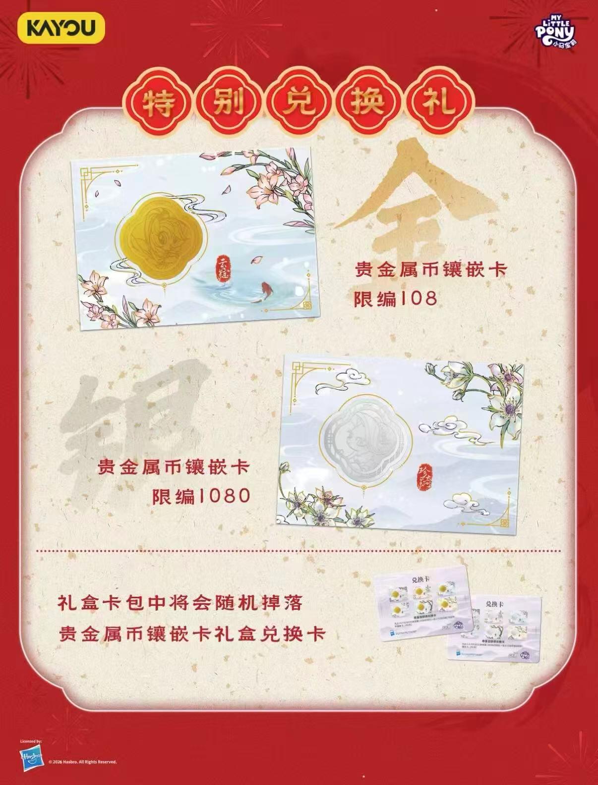 小马宝莉福来启运第二弹已到店上新🤩马年买小马 咱把新春祝福带回家✨ 全新MT金属镶嵌卡每盒必出1张,用不一样的形式为你定格小马们在冬日的宁静与美好,除此之外还有机会在卡包中拆出兑换卡,兑换金/银贵金属币镶嵌卡礼盒,金玉满堂、福运满满~ 宝子们可以线上联系 外地可顺丰到付 也可以到店选购喔🌟