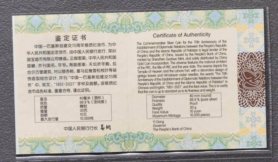 央行2021年9月16日发行的中国-巴基斯坦建交70周年30克圆形银质纪念币(属一套2枚金银币中的银币),为中华人民共和国法定货币 。