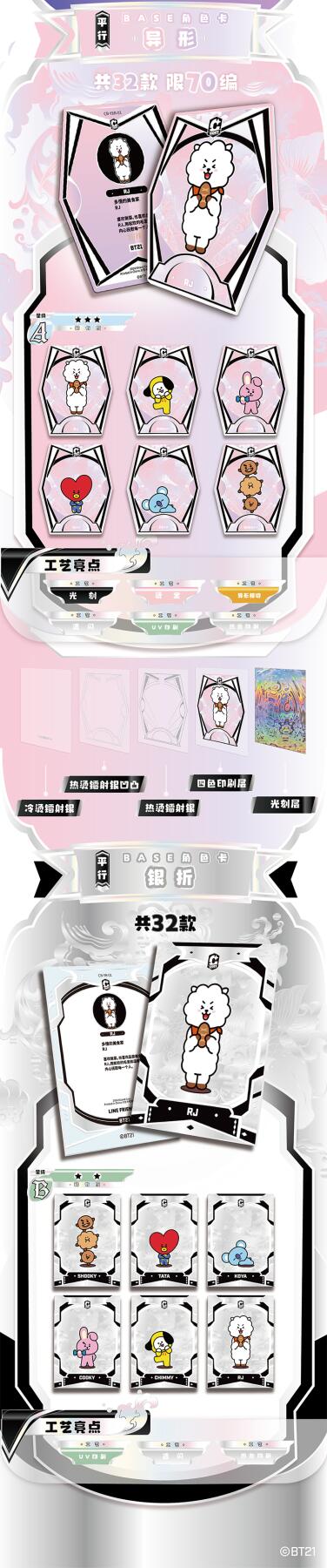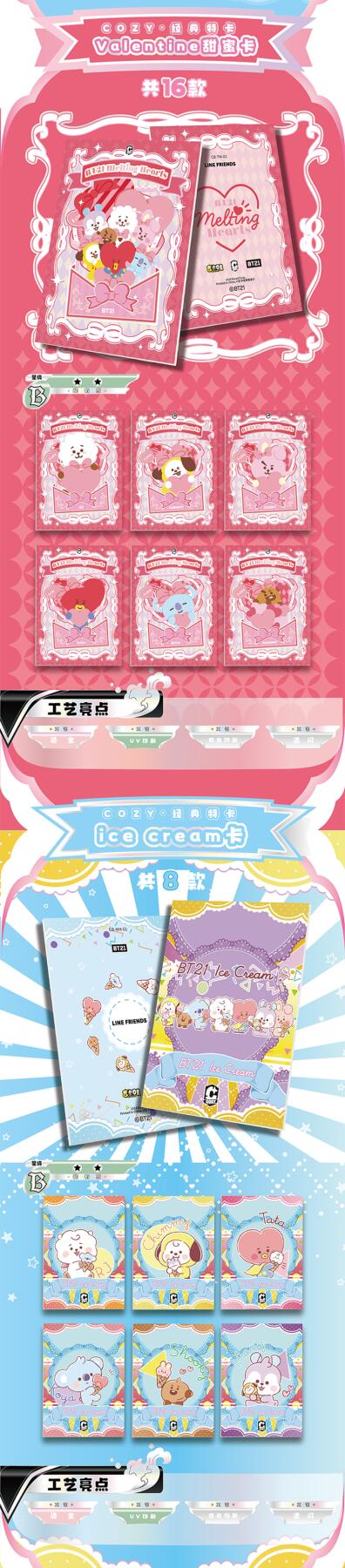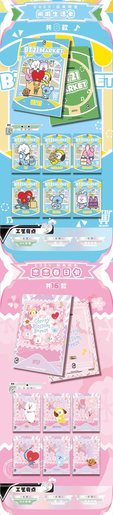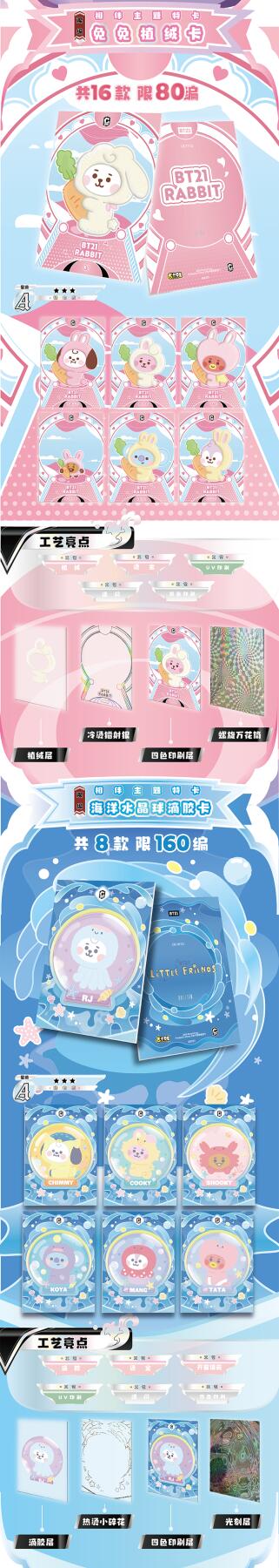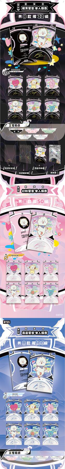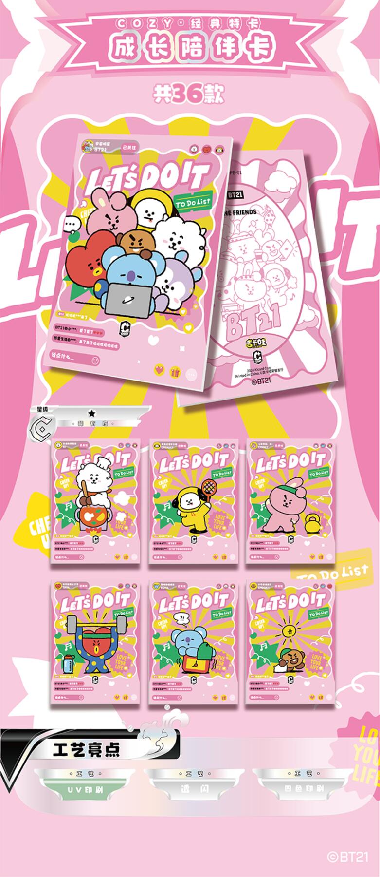 把星河捧在手心!BT21《成长相伴》收藏卡牌正式开订啦!以治愈萌趣的BT21角色为核心,用细腻画风定格每一份温暖陪伴,把星光与可爱都装进卡片里,无论是收藏、分享还是日常拆卡,都满是治愈与惊喜。产品规格清晰贴心:36盒/箱,10包/盒,每包内含2-3张精美卡牌,盲盒式拆包乐趣拉满,每一包都藏着不期而遇的可爱。从日常摆拍、桌面装饰到成套收藏,都能轻松hold住,是粉丝必入的心意好物。预计12月上旬发货,现在火热收单中!数量有限,先订先得,快把属于你的星河与BT21一起带回家,让萌趣角色陪你走过每一段温柔时光,解锁收藏新快乐!