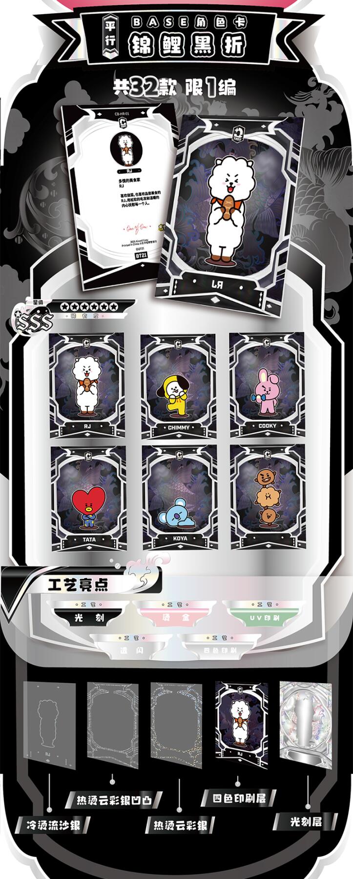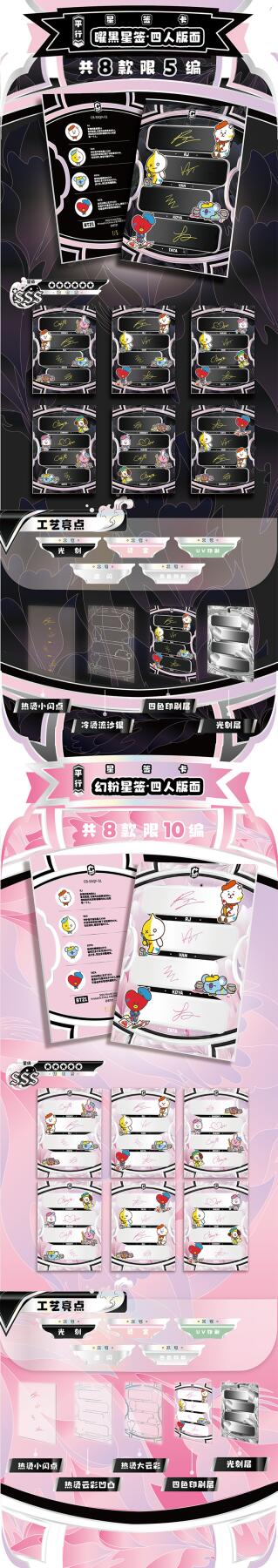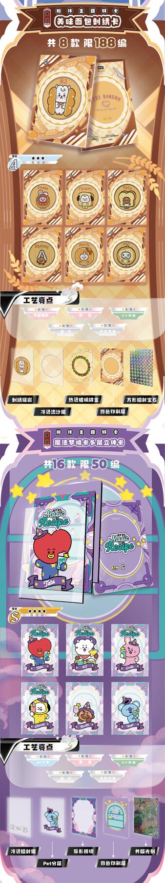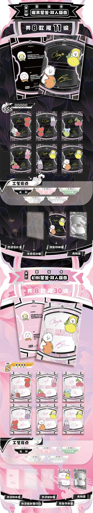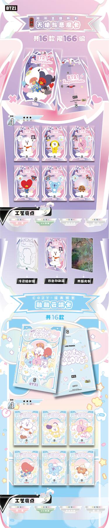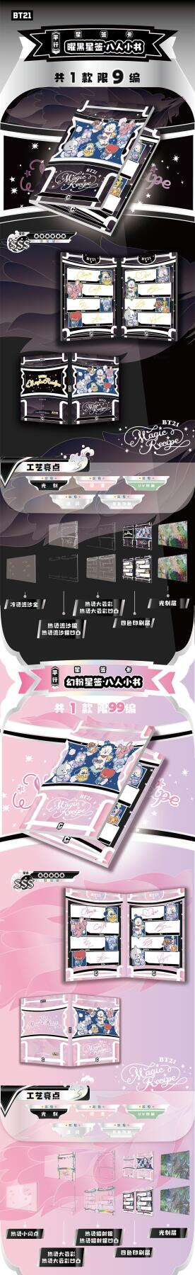 把星河捧在手心!BT21《成长相伴》收藏卡牌正式开订啦!以治愈萌趣的BT21角色为核心,用细腻画风定格每一份温暖陪伴,把星光与可爱都装进卡片里,无论是收藏、分享还是日常拆卡,都满是治愈与惊喜。产品规格清晰贴心:36盒/箱,10包/盒,每包内含2-3张精美卡牌,盲盒式拆包乐趣拉满,每一包都藏着不期而遇的可爱。从日常摆拍、桌面装饰到成套收藏,都能轻松hold住,是粉丝必入的心意好物。预计12月上旬发货,现在火热收单中!数量有限,先订先得,快把属于你的星河与BT21一起带回家,让萌趣角色陪你走过每一段温柔时光,解锁收藏新快乐!