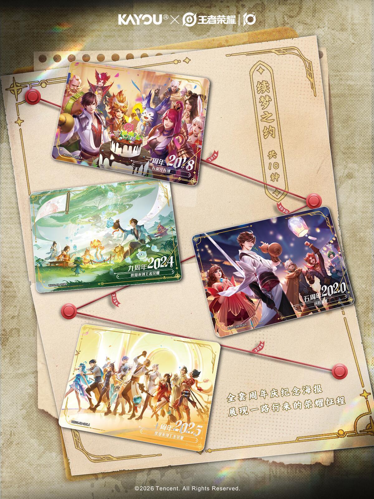 卡游×王者荣耀 英雄万相收藏卡 十年荣耀 官方全新天元系列素材首发,雅致精细而不失气概,展现英雄们独特的魅力。 同时卡面收录多款年限皮肤以及周年庆海报,搭配不同风格的边框与厚卡材质,纪念英雄与召唤师共同走过的十载时光,传承历年美好祈愿。