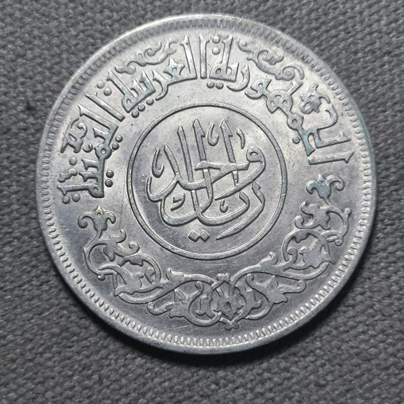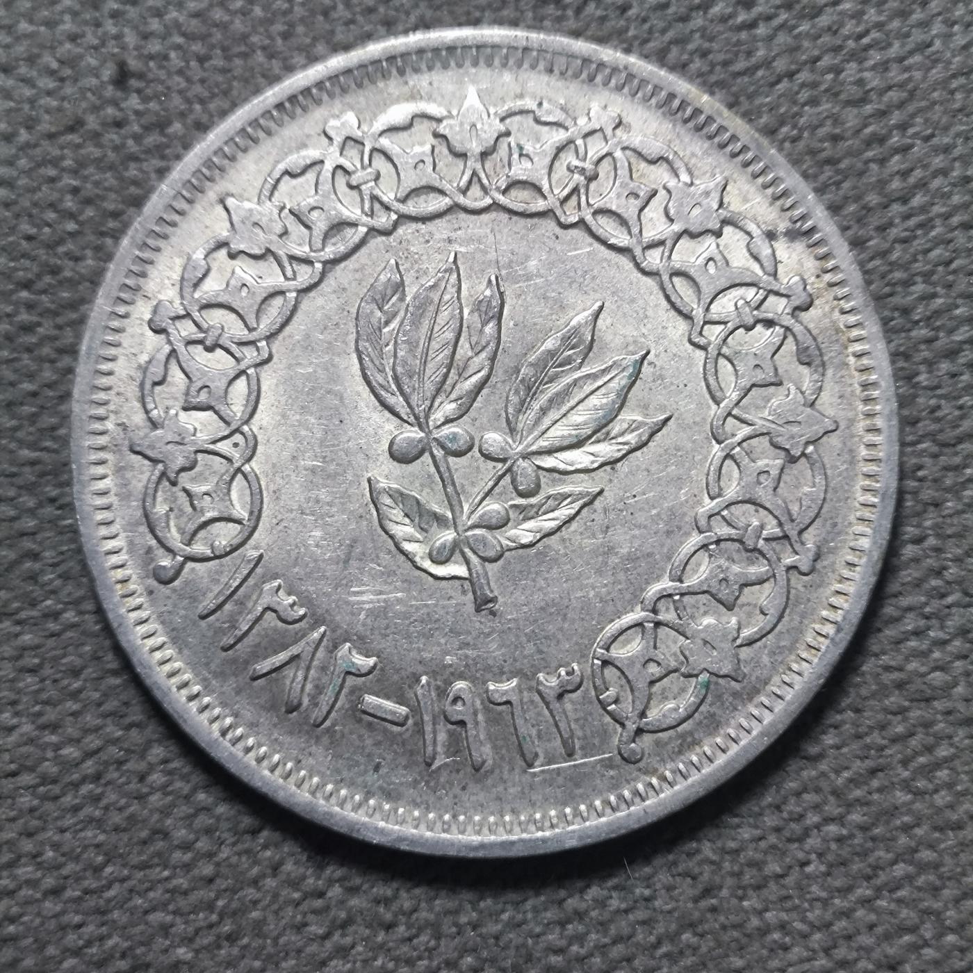 这是一枚1963年(伊斯兰历1382年)阿拉伯也门共和国1里亚尔银币,以下是详细介绍: