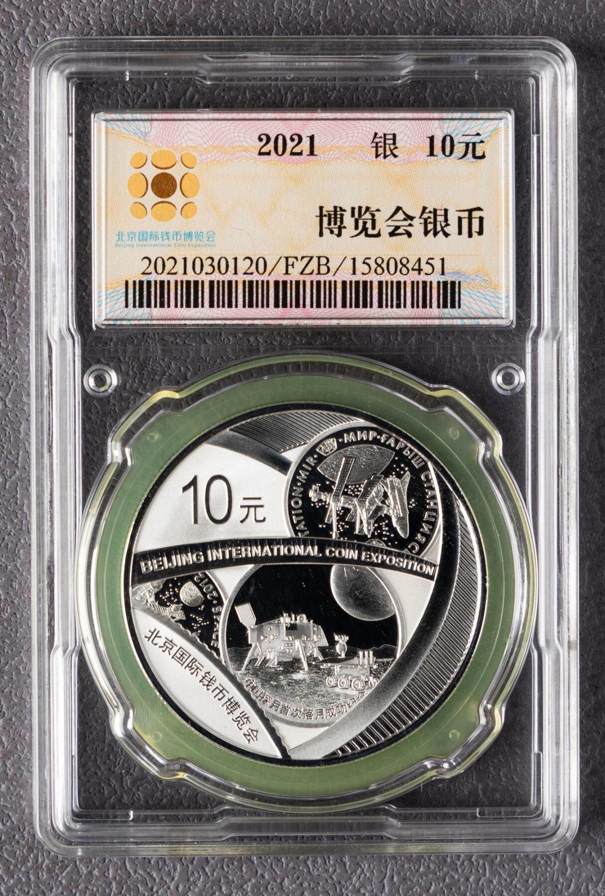 - 背面:中国探月落月银币图案 + 哈萨克斯坦和平号空间站纪念币图案,配钱币元素,刊中英文展会名与10元面额