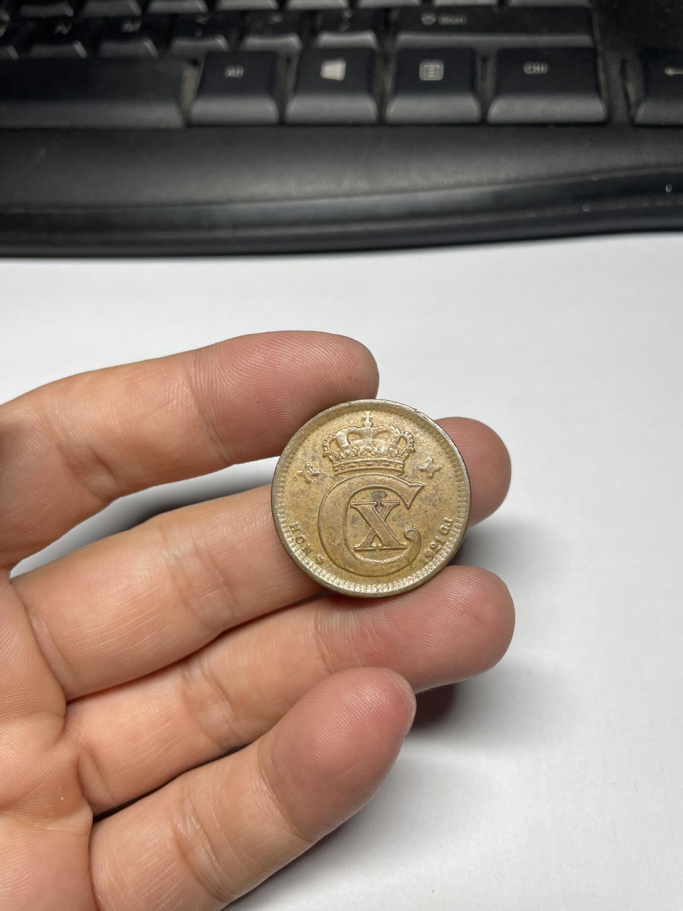 这是一枚1916年丹麦王国发行的5欧尔(Øre)铜币,属于丹麦国王克里斯蒂安十世(Christian X)时期的流通辅币。