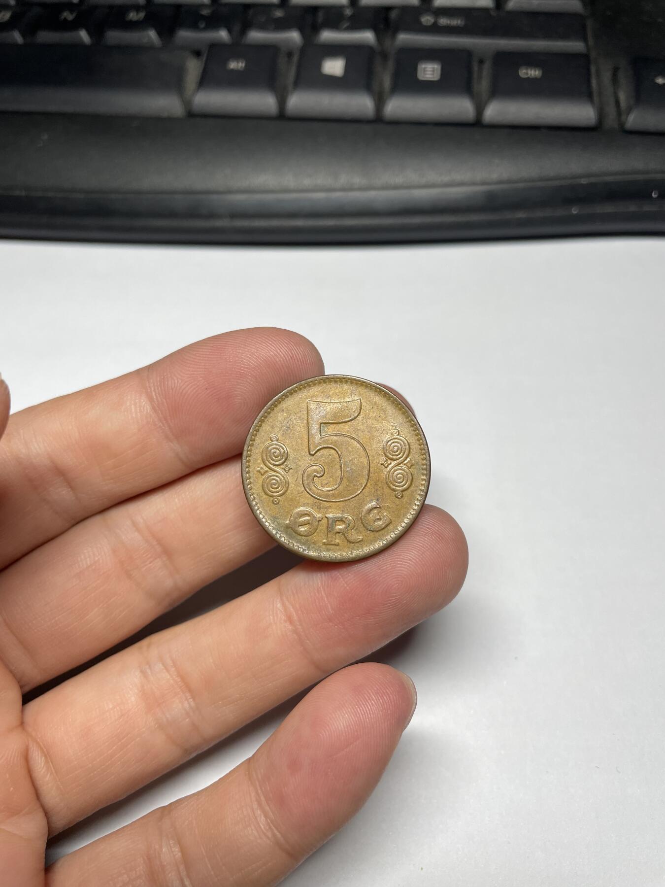- 中央是面值“5 ØRE”,两侧装饰有对称的涡卷纹图案。