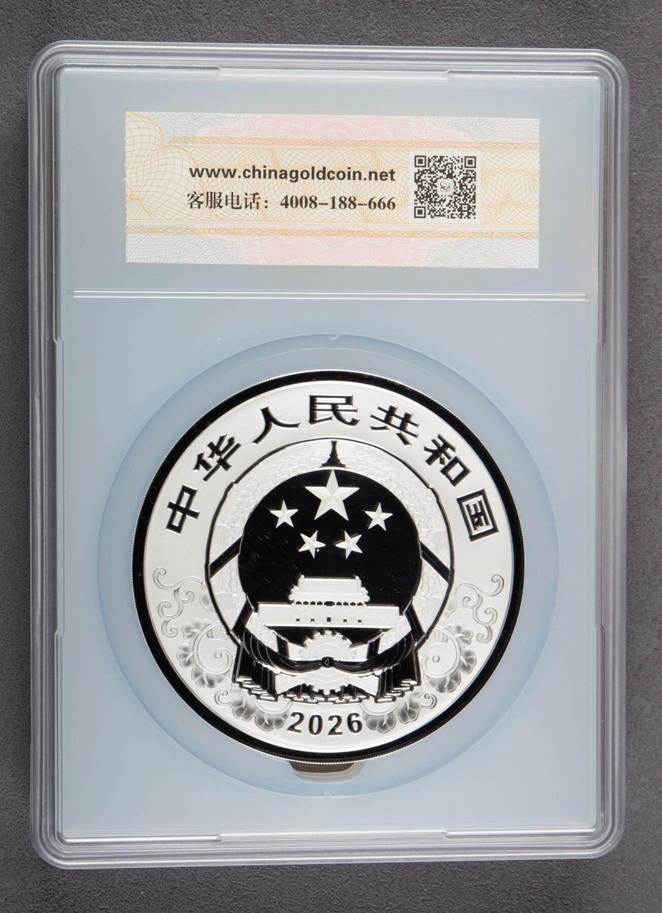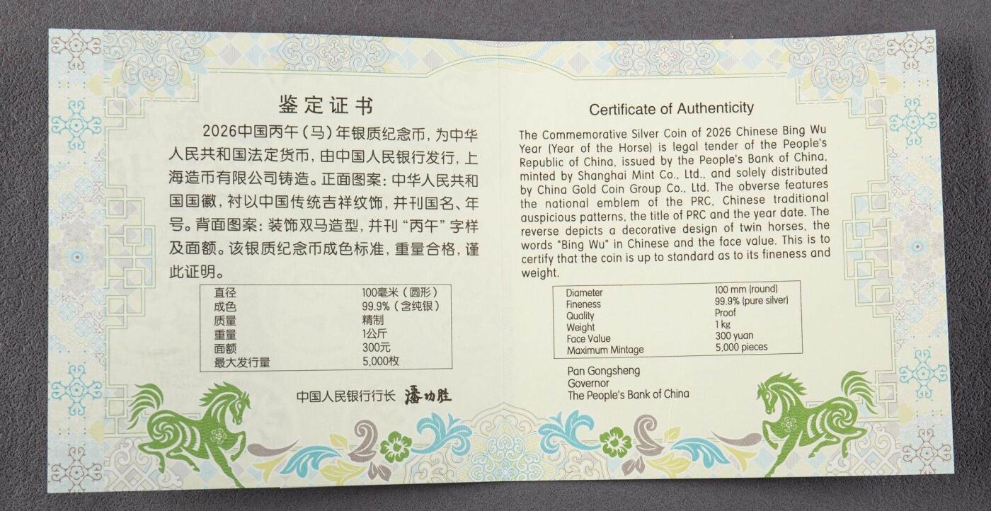 一、官方核心参数(2026丙午马年1公斤圆形精制银币) - 发行:中国人民银行,2025-11-26发行;中国金币总公司总经销 - 材质:99.9%纯银,1公斤(1000g),精制币 - 规格:直径100mm,面额300元 - 发行量:5000枚(生肖公斤银中属中等发行量) - 图案:正面国徽+吉祥纹饰,刊国名、年号;背面装饰双马,刊“丙午”与面额