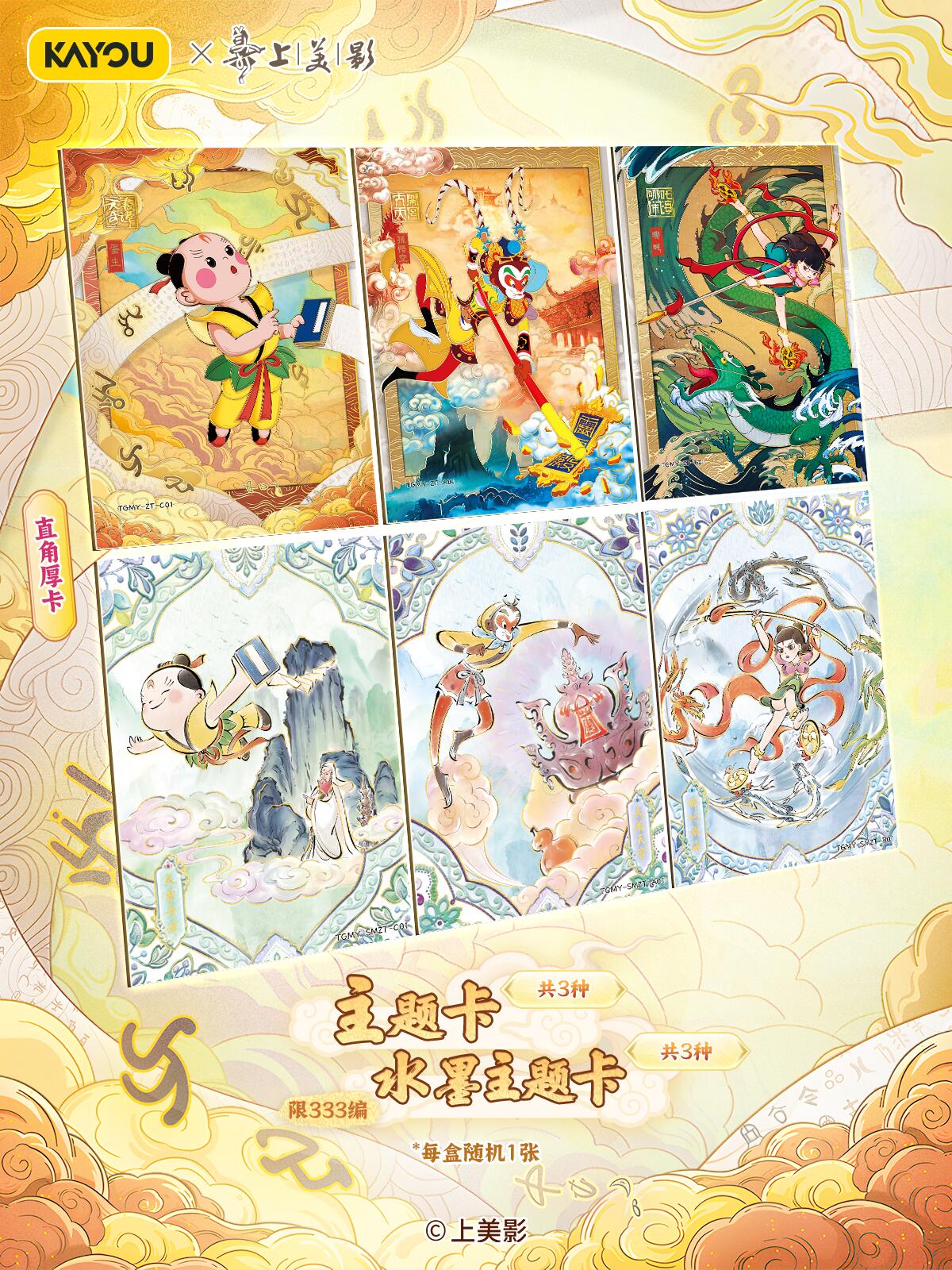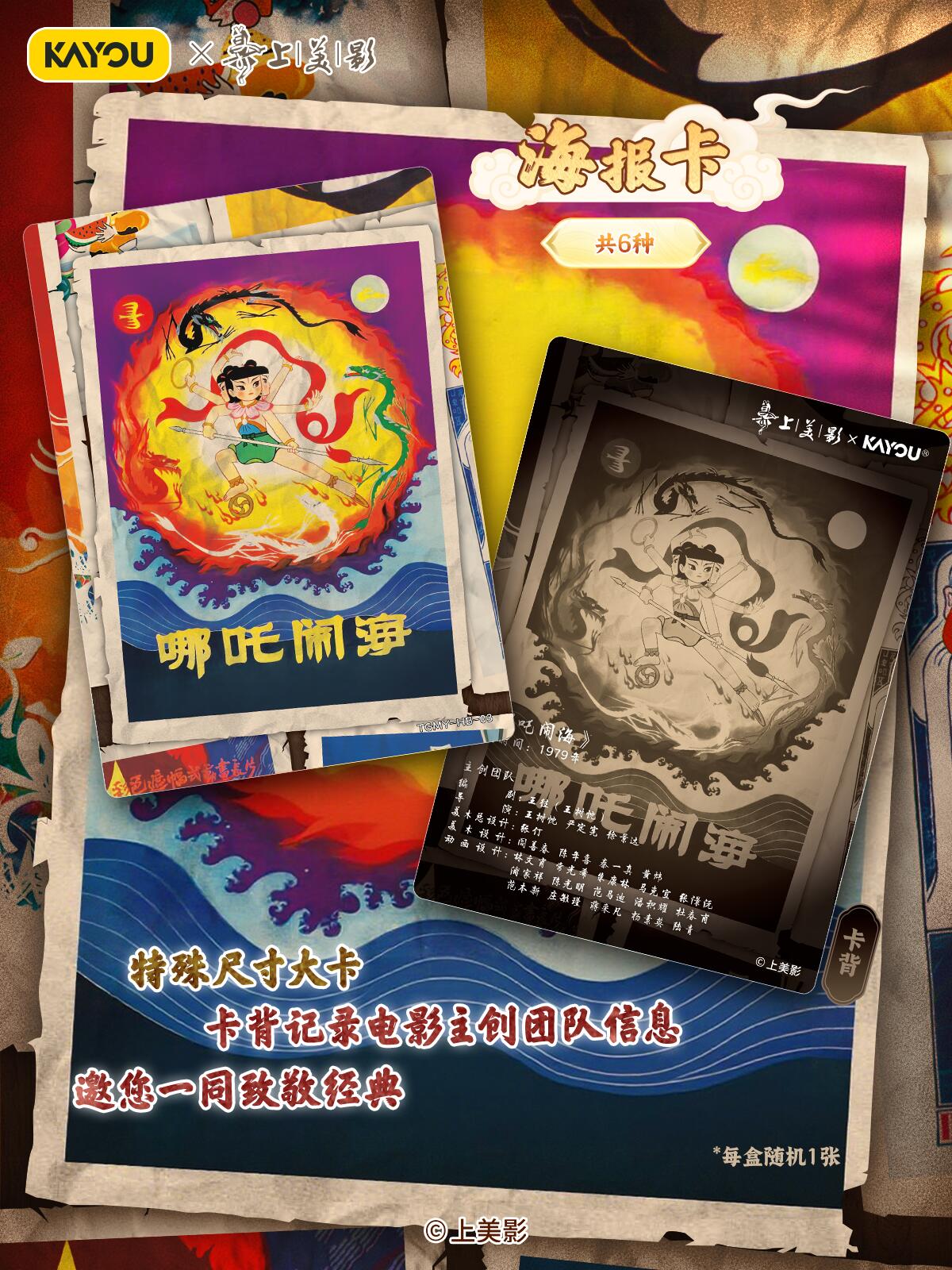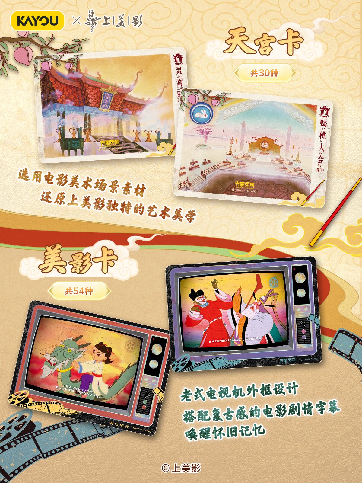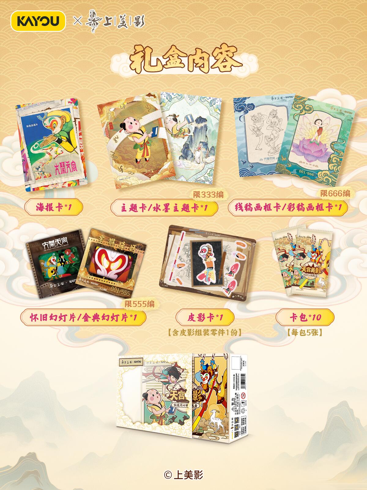 致敬经典!天宫美影收藏礼盒温馨上线 【上影元文化授权】卡游 天宫美影 仙途问心收藏礼盒 现已正式上线! 收录上海美术电影制片厂的6个经典神话《大闹天宫》《猪八戒吃西瓜》《哪吒闹海》《九色鹿》《天书奇谭》《金猴降妖》,收录经典角色与故事,展现国潮魅力,唤醒你的童年回忆。 卡游邀请多位知名画师合作,重绘经典神话,用不同风格的精彩卡面,致敬经典,诠释上美影的独特艺术美学,更有趣味皮影DIY玩法,在指尖解锁传统技艺。