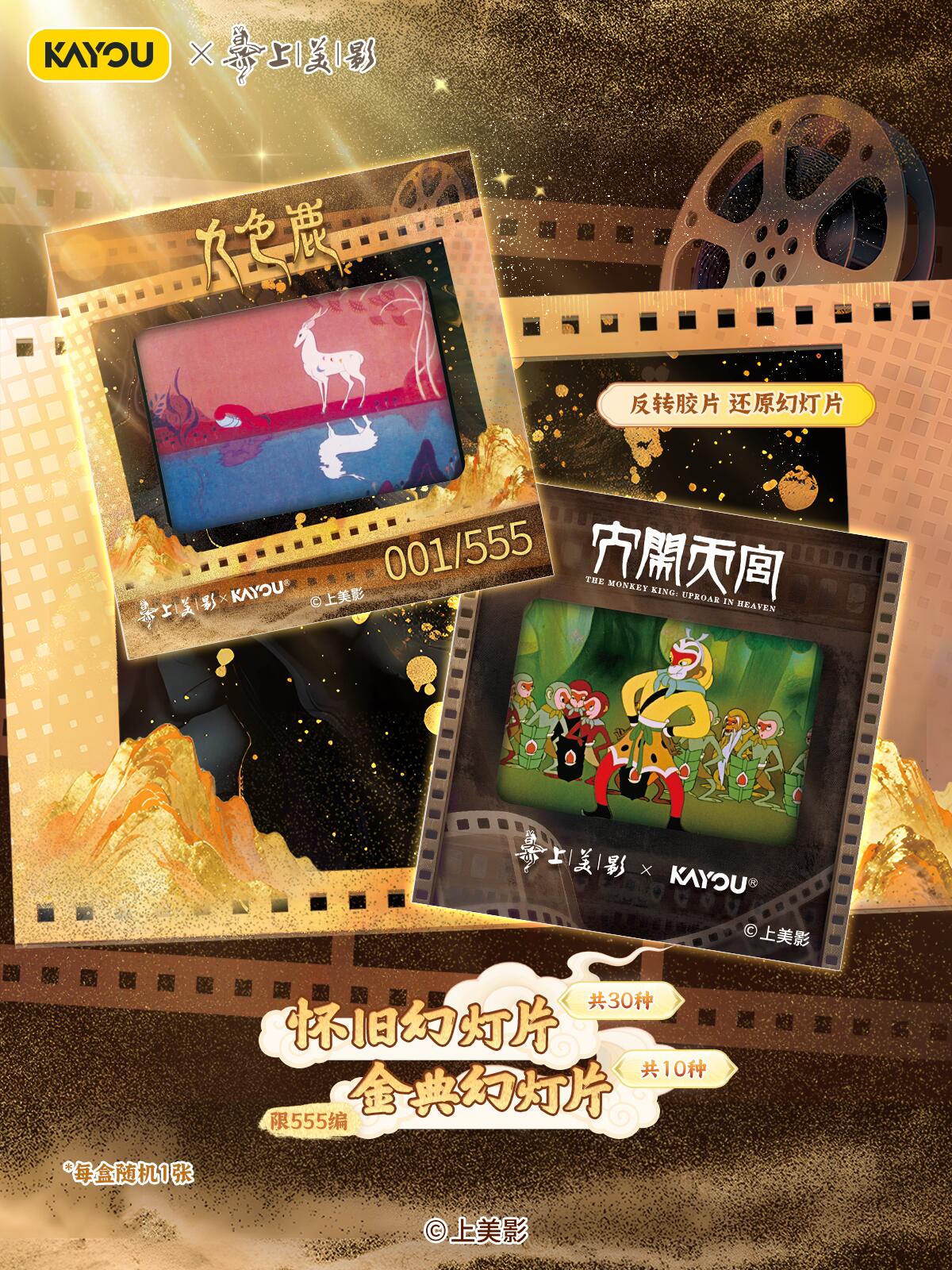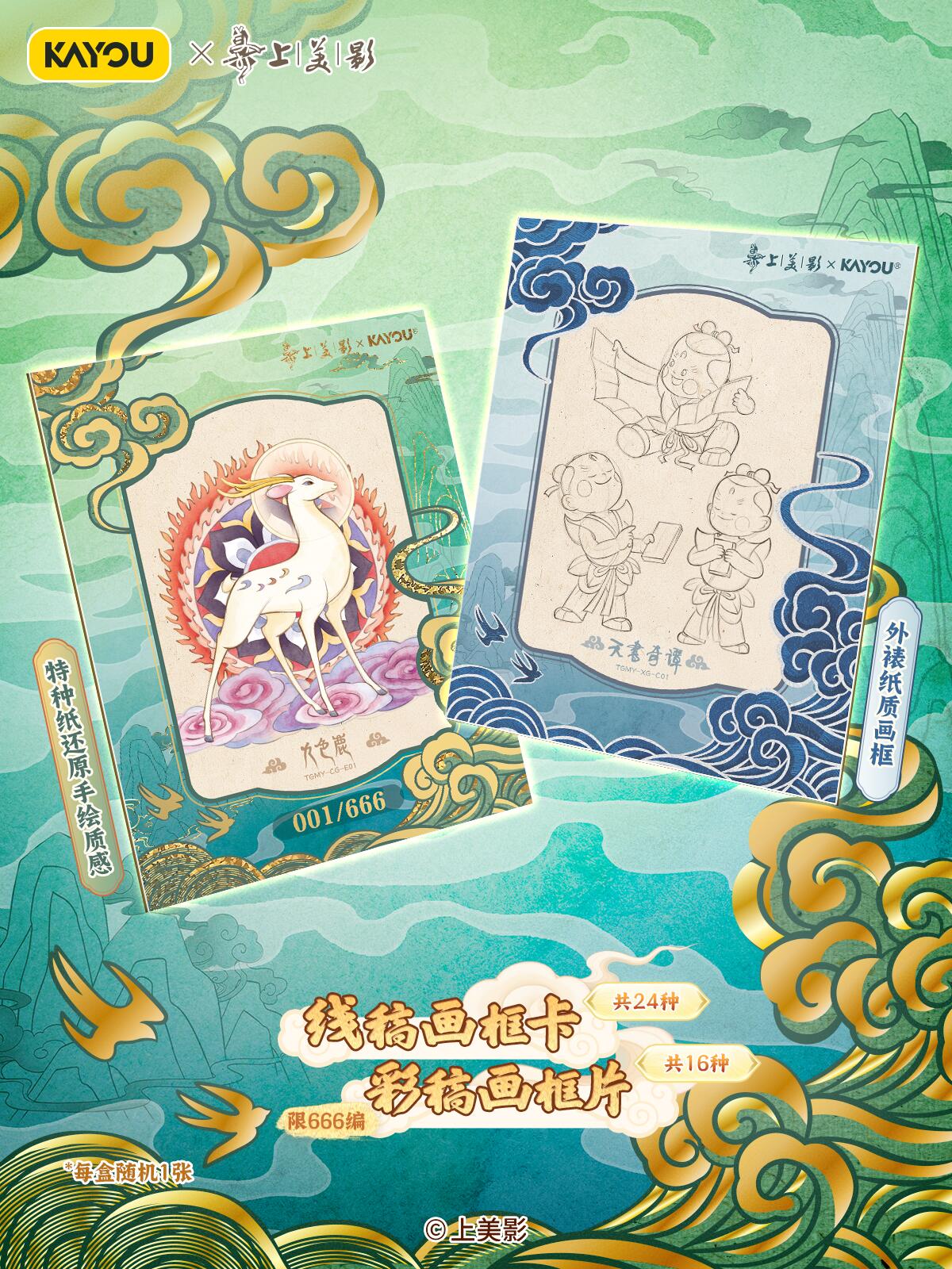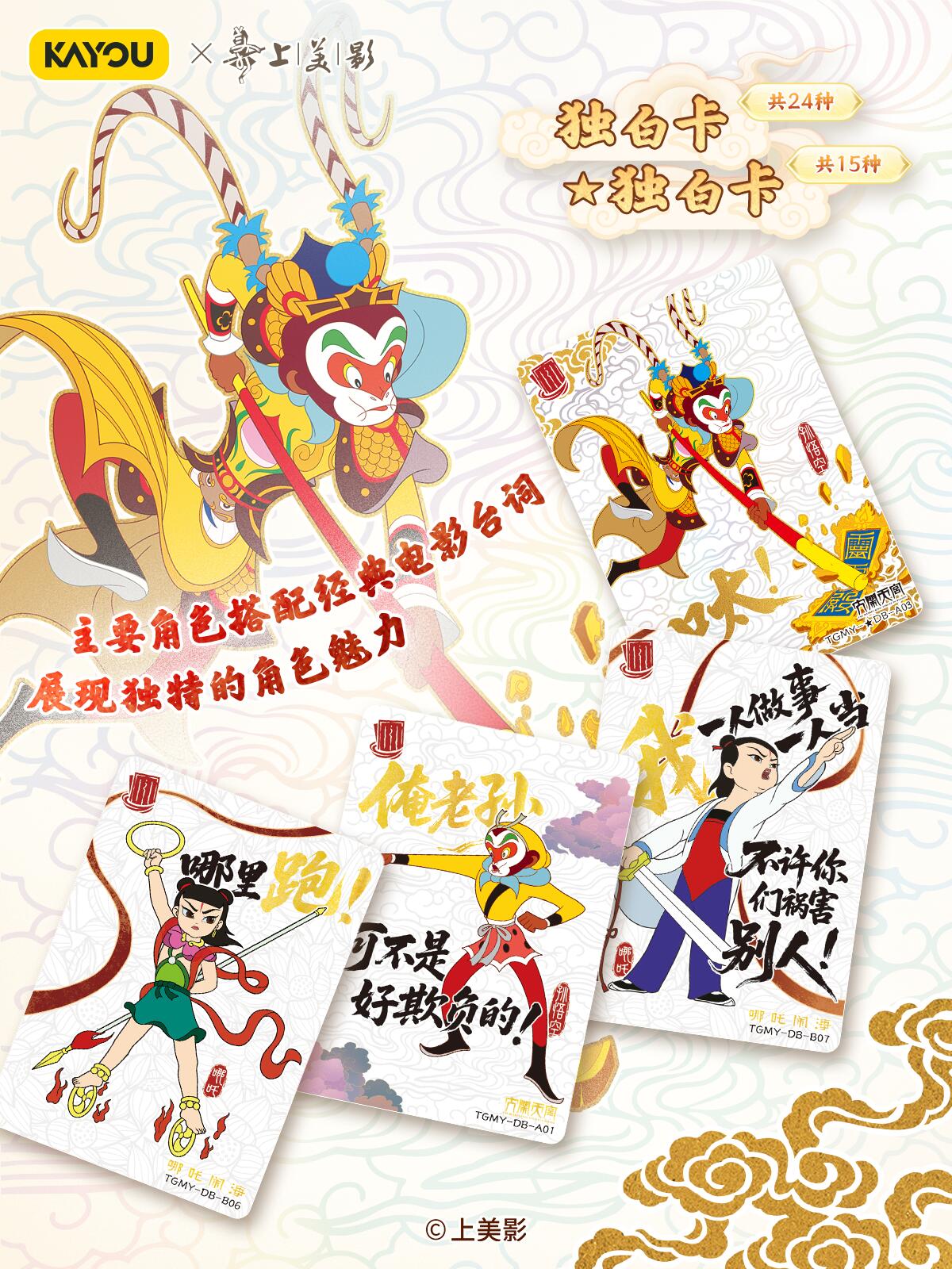 致敬经典!天宫美影收藏礼盒温馨上线 【上影元文化授权】卡游 天宫美影 仙途问心收藏礼盒 现已正式上线! 收录上海美术电影制片厂的6个经典神话《大闹天宫》《猪八戒吃西瓜》《哪吒闹海》《九色鹿》《天书奇谭》《金猴降妖》,收录经典角色与故事,展现国潮魅力,唤醒你的童年回忆。 卡游邀请多位知名画师合作,重绘经典神话,用不同风格的精彩卡面,致敬经典,诠释上美影的独特艺术美学,更有趣味皮影DIY玩法,在指尖解锁传统技艺。