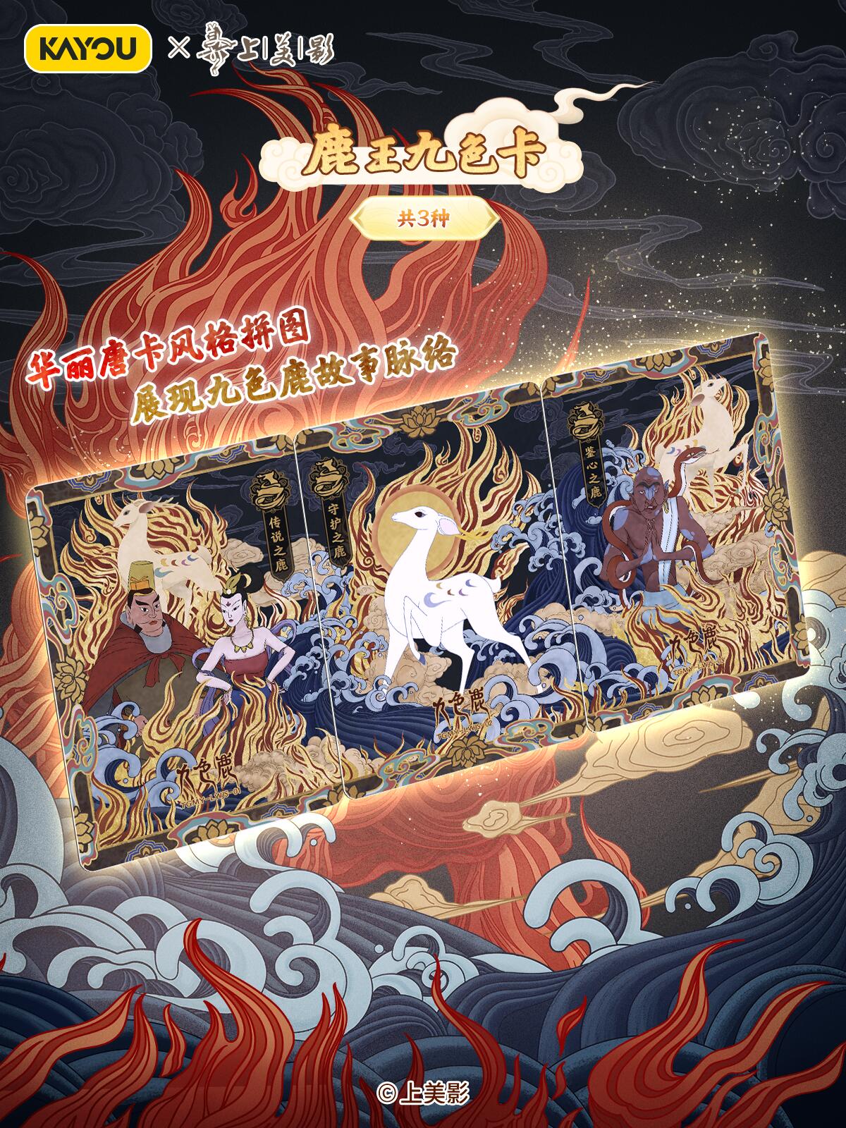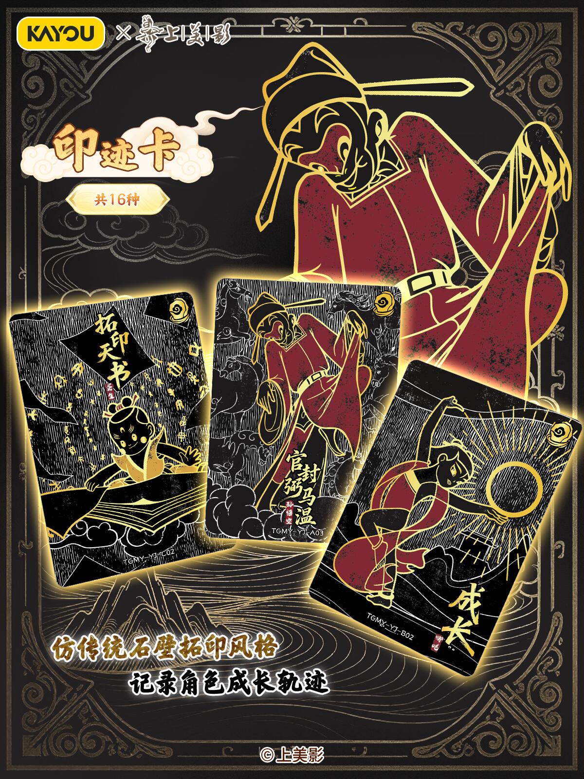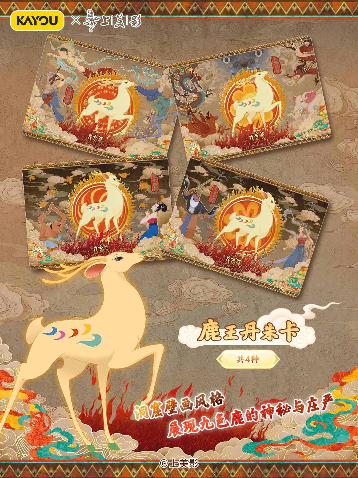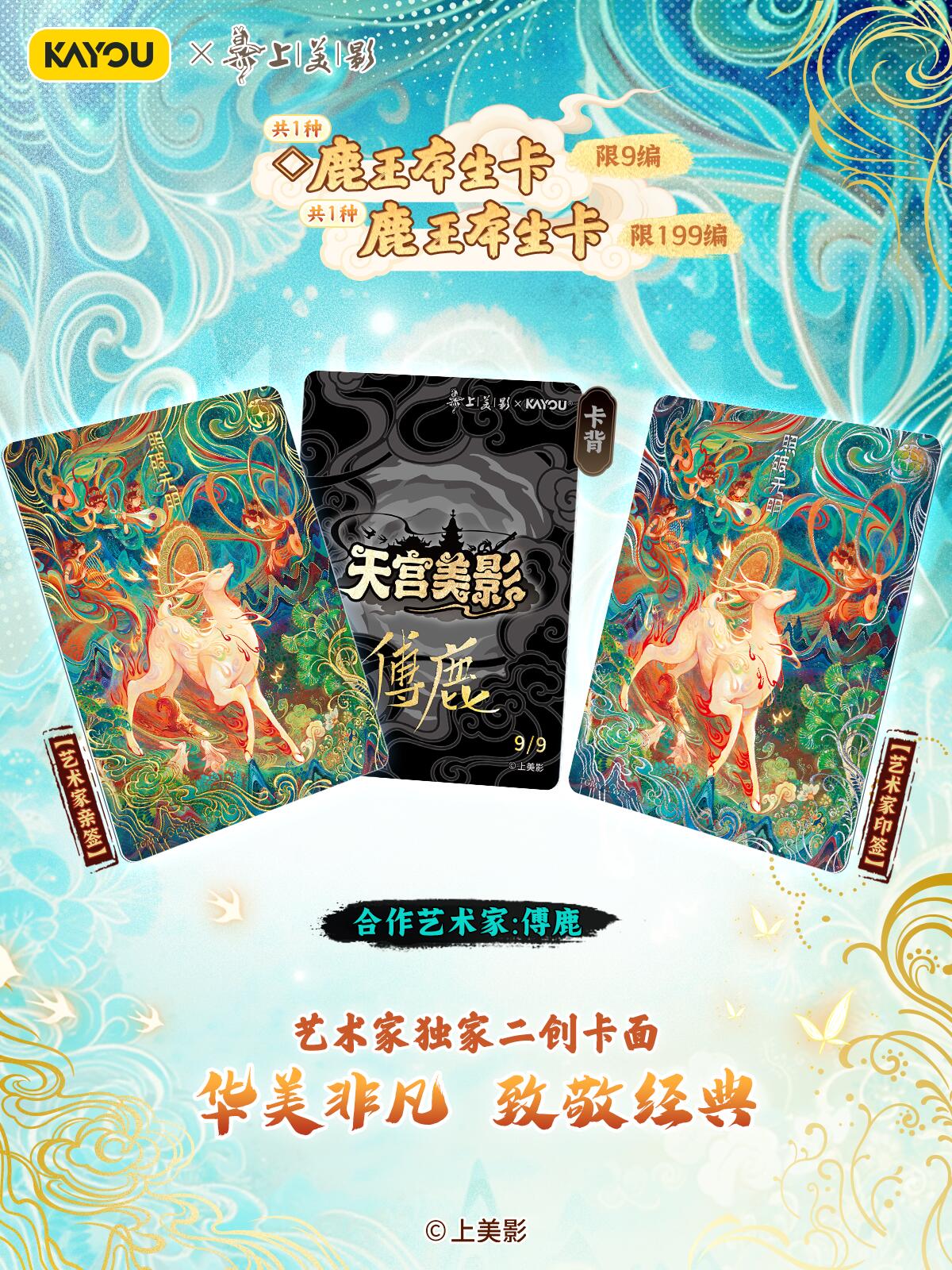 致敬经典!天宫美影收藏礼盒温馨上线 【上影元文化授权】卡游 天宫美影 仙途问心收藏礼盒 现已正式上线! 收录上海美术电影制片厂的6个经典神话《大闹天宫》《猪八戒吃西瓜》《哪吒闹海》《九色鹿》《天书奇谭》《金猴降妖》,收录经典角色与故事,展现国潮魅力,唤醒你的童年回忆。 卡游邀请多位知名画师合作,重绘经典神话,用不同风格的精彩卡面,致敬经典,诠释上美影的独特艺术美学,更有趣味皮影DIY玩法,在指尖解锁传统技艺。