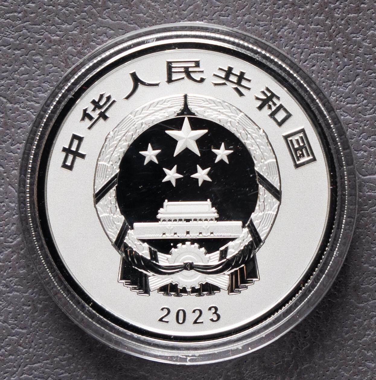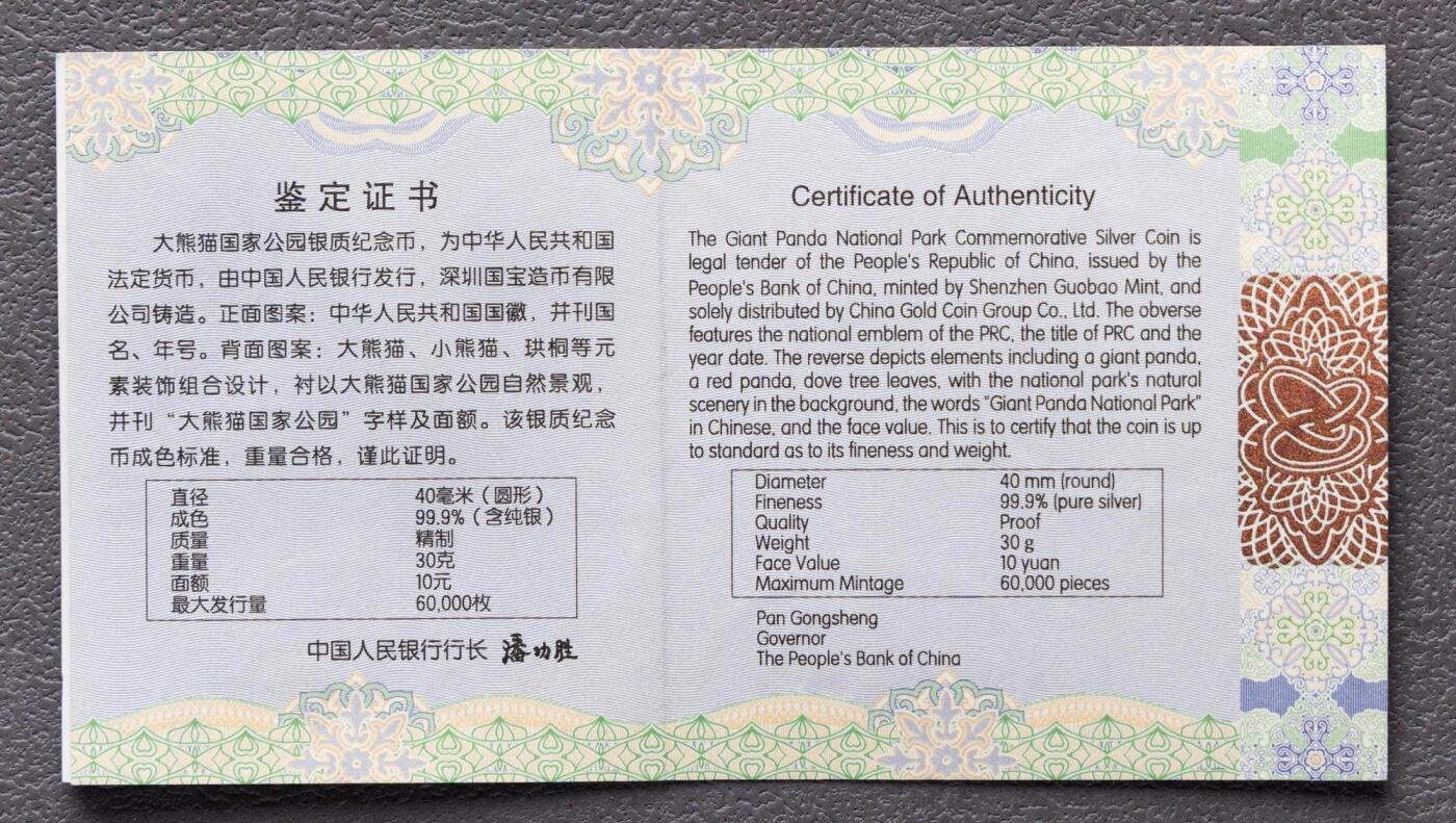 1. 核心规格:面额10元,成色99.9%银,重量30克,圆形直径40mm,精制工艺;最大发行量60000枚 2. 图案工艺:正面为国徽,刊国名、2023年号;背面为大熊猫+小熊猫+珙桐,衬以四姑娘山景观,局部彩喷,刊“大熊猫国家公园”与面额