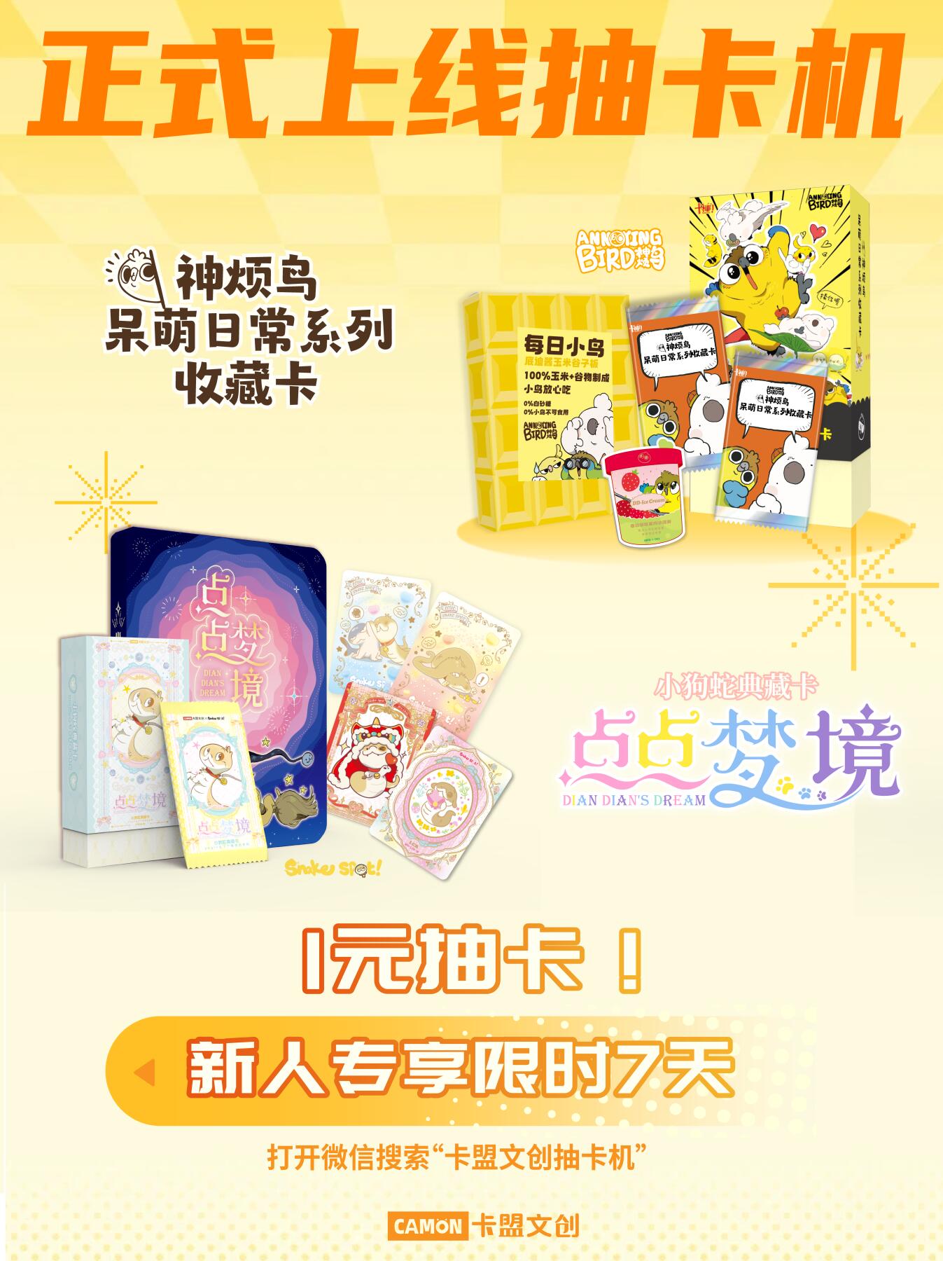 1元首抽!卡盟文创抽卡机上新! 卡盟文创×yogin幺了个菁系列收藏卡牌 👉 《神烦鸟呆萌日常系列收藏卡》搞怪又治愈的小鸟日常,每一张都萌到心化~ 👉 《点点梦境-小狗蛇典藏卡》软萌小狗蛇闯入梦幻秘境,画风治愈又梦幻! - 新人7天限时福利,1元首抽! VX小程序搜索“卡盟文创抽卡机” 一起快乐抽卡吧。