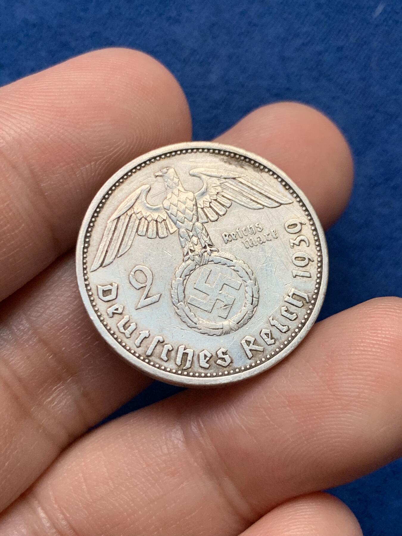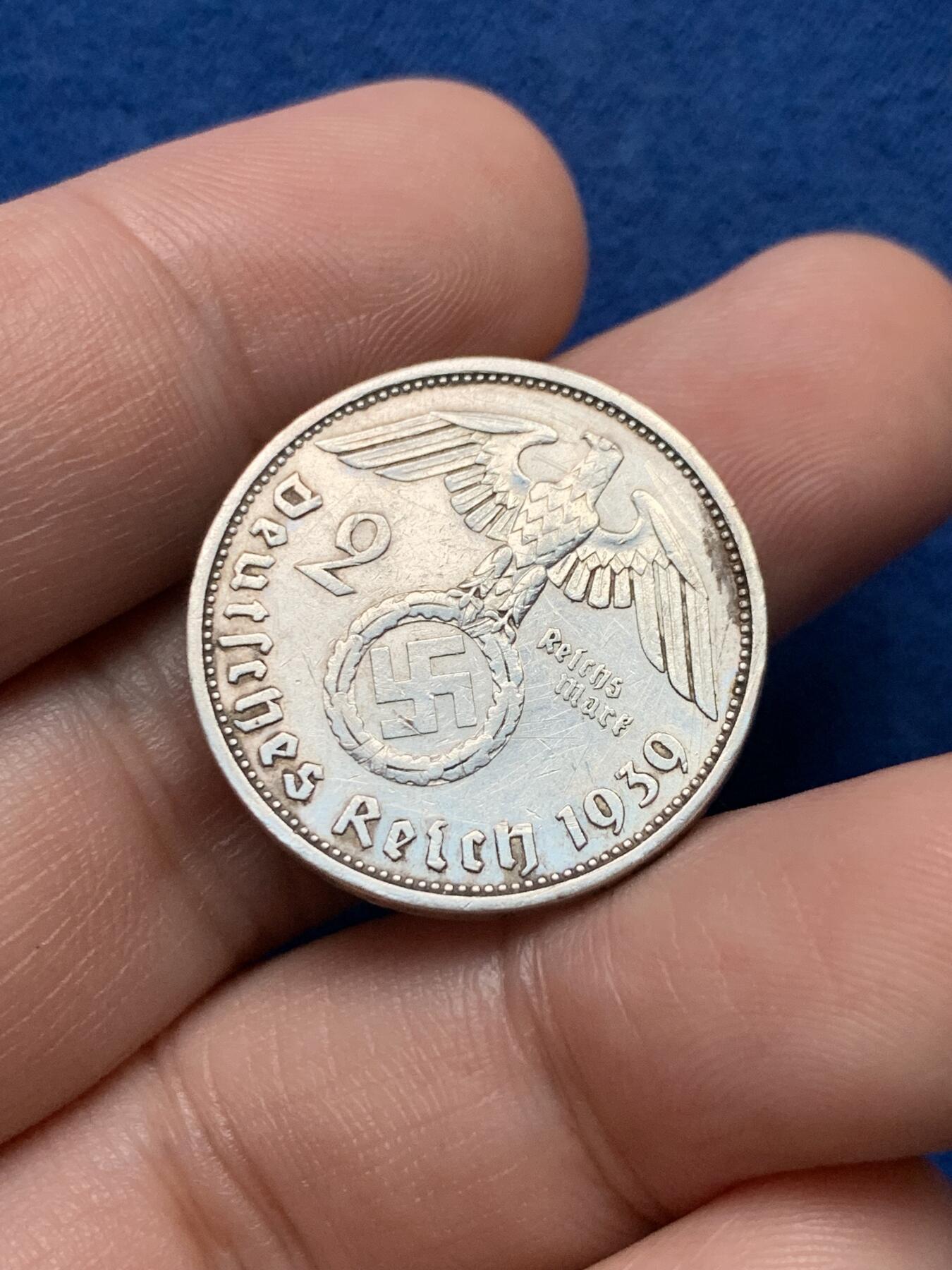 这是一枚1939年发行的德国第三帝国2帝国马克(Reichsmark)银币,是纳粹德国时期的流通货币,同时也带有强烈的时代符号。