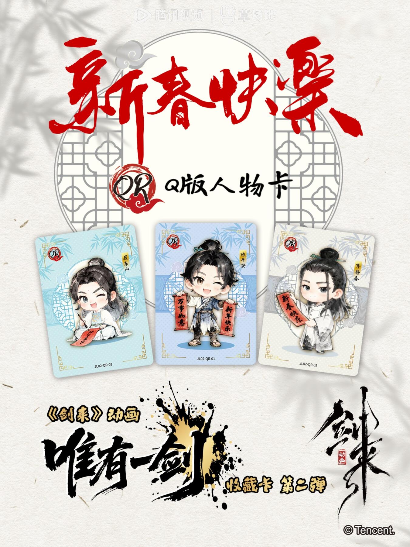 《剑来》动画「唯有一剑」收藏卡第二弹 水墨江湖,一剑珍藏! 官方抽卡机现已上线 @腾讯视频草场地 共19个系列,208款卡面邀你共闯江湖 更特邀知名配音演员陈张太康(CV:陈平安),亲笔落款,与你共藏此境。 🎁礼赠2026年2月10日2026年06月30日(数量有限,先到先得) *满150抽送免费抽奖次数*5 *满300抽送包邮券*1 *满500抽送免费抽奖次数*10
