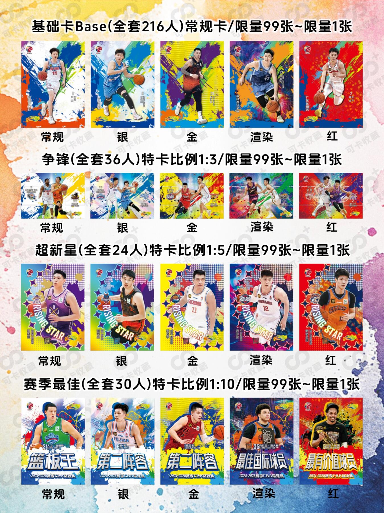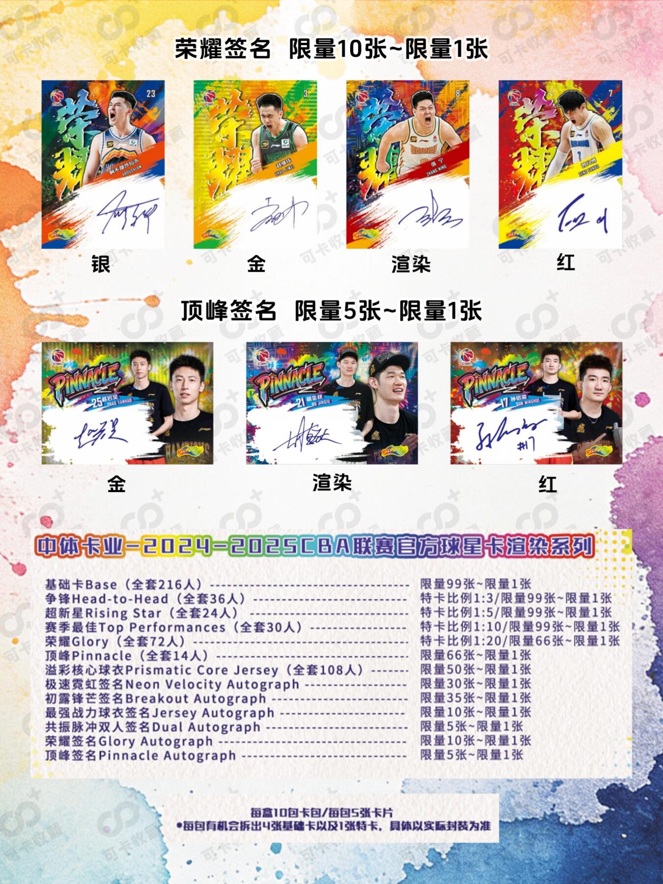 优品推荐|2425 CBA联赛官方球星卡今日发售 24-25赛季CBA联赛官方球星卡「渲染系列」 ✅今日正式开售!中体卡业正版授权 产品亮点✨ ▫️5张/包,10包/盒,每盒保一张签字或者球衣 ▫️泼墨艺术风+炫彩视觉,颜值拉满 ▫️基础卡阵容超全,一盒包揽216名球员 ▫️超新星特卡/荣耀特卡/荣耀签字/共振脉冲双人签字......