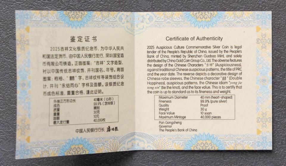 - 发行日期:2025年5月11日;最大发行量40000枚;精制币,99.9%纯银,30克,心形,外接正方形边长40mm,面额10元。 - 正面:“吉祥”文字+传统纹饰,刊国名、2025年号;背面:袍袖、红“囍”、龙凤/牡丹/蝴蝶纹样,光变鳞彩+局部镀金,刊“永结同心”及面额;带央行鉴定证书、原装盒