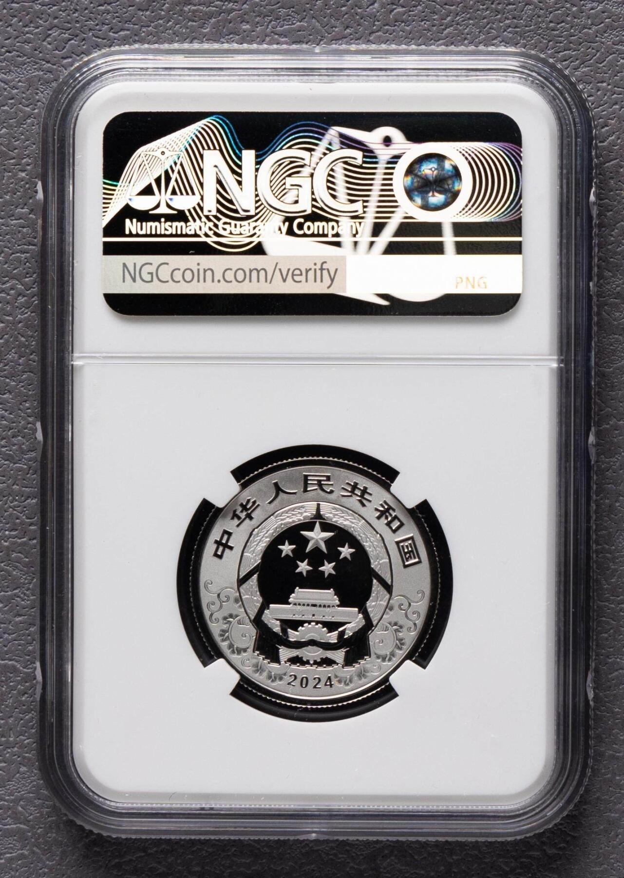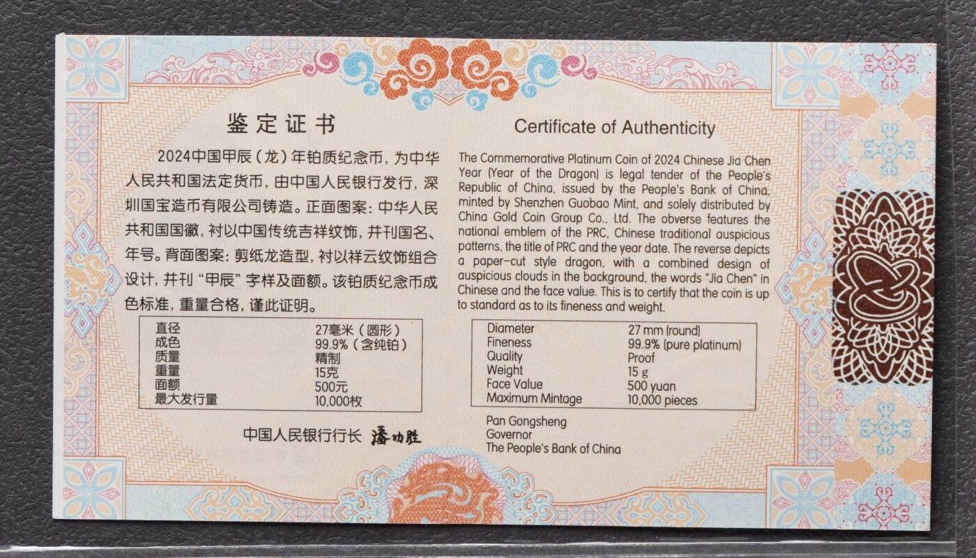 1. 材质规格:精制铂币,含纯铂15克,成色99.9%;直径27mm,面额500元 2. 发行量:最大发行量10000枚 3. 图案:正面国徽+传统吉祥纹饰、国名+2024年号;背面剪纸龙(彩喷红)+祥云,刊“甲辰”与面额 4. 工艺:镜面底面,多层次喷砂,彩喷点睛;初始发售价4900元 5. 铸造/经销:沈币/上币/深国宝造币,中国金币总经销