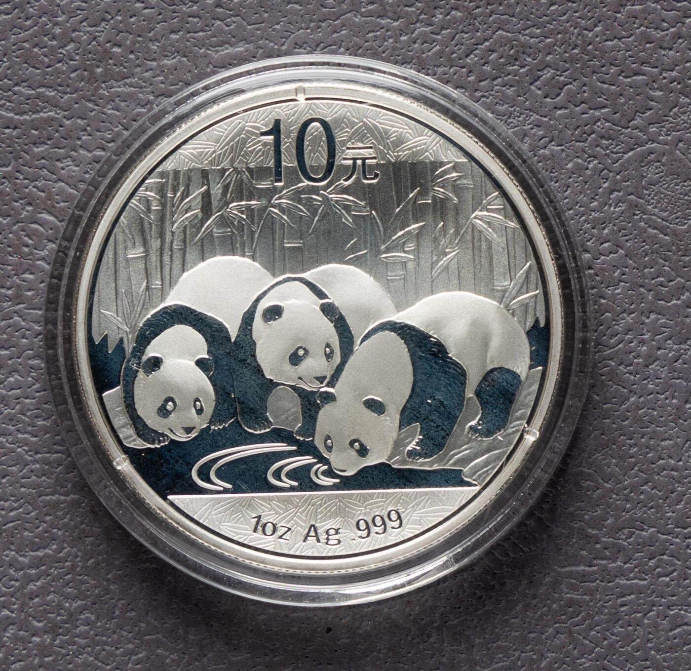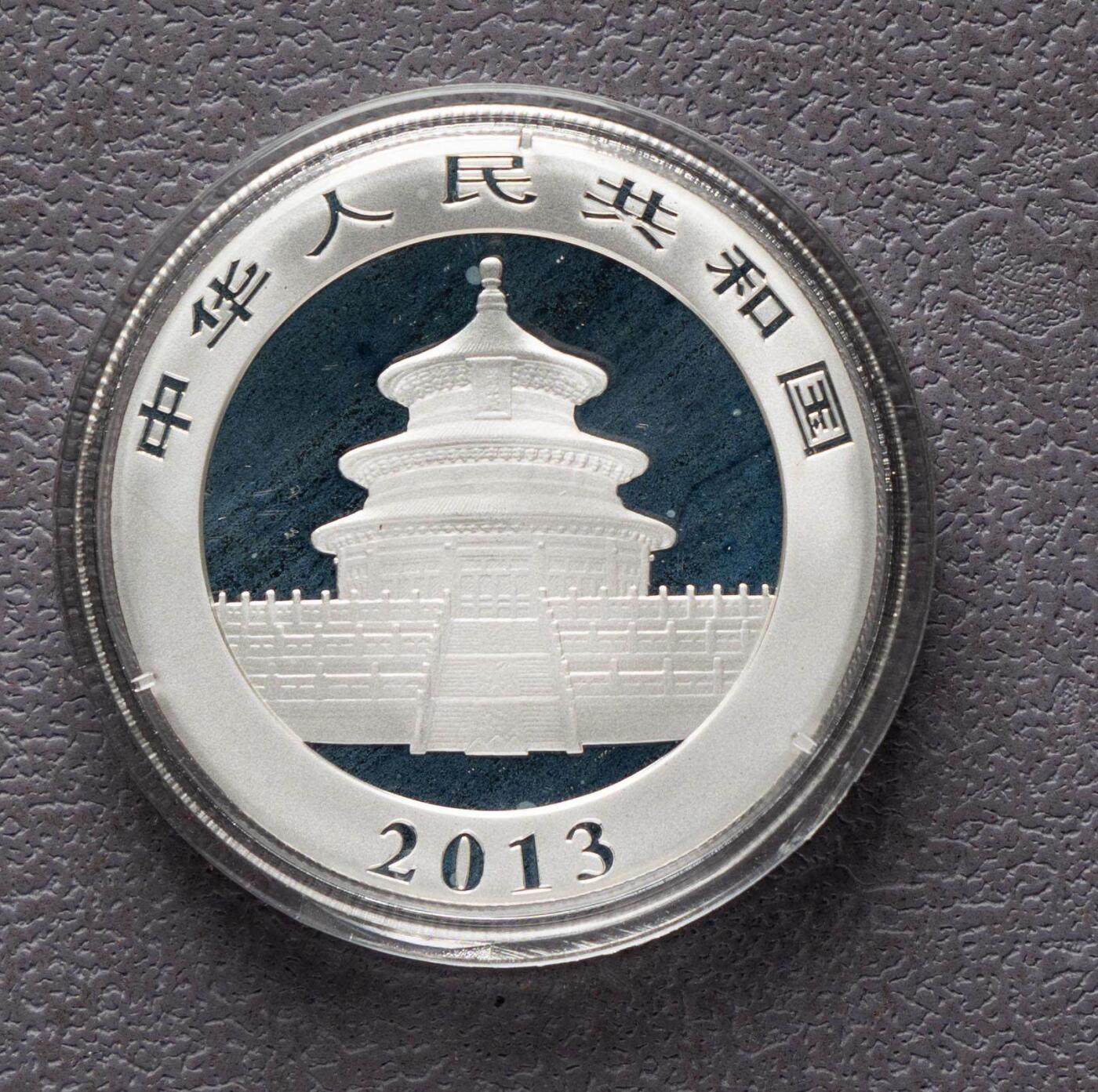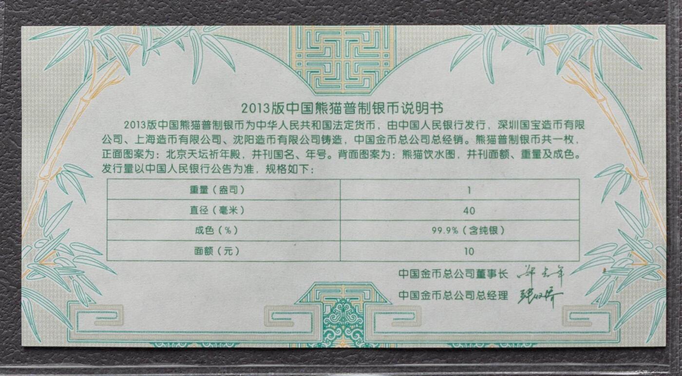 1. 材质规格:纯银1盎司(31.1035克),成色99.9%;直径40mm,面额10元,普制;最大发行量800万枚 2. 图案:正面北京天坛祈年殿+国名、2013年号;背面三只熊猫饮水图,刊面额、重量、成色 3. 铸造经销:沈币/上币/深国宝,中国金币总经销