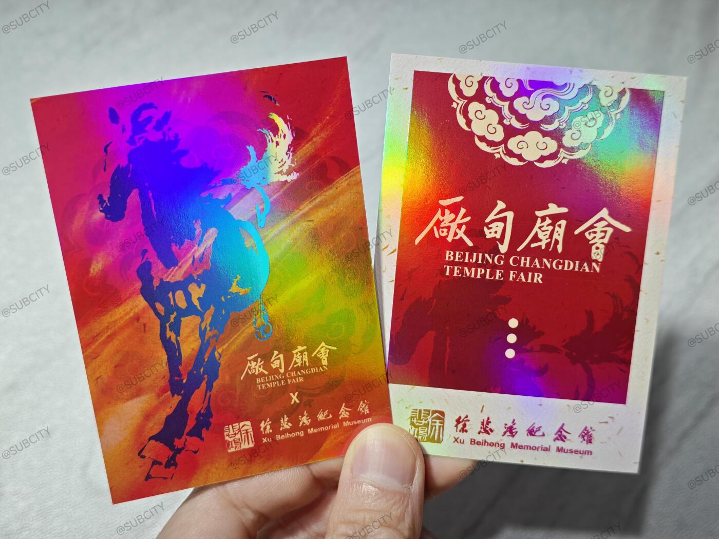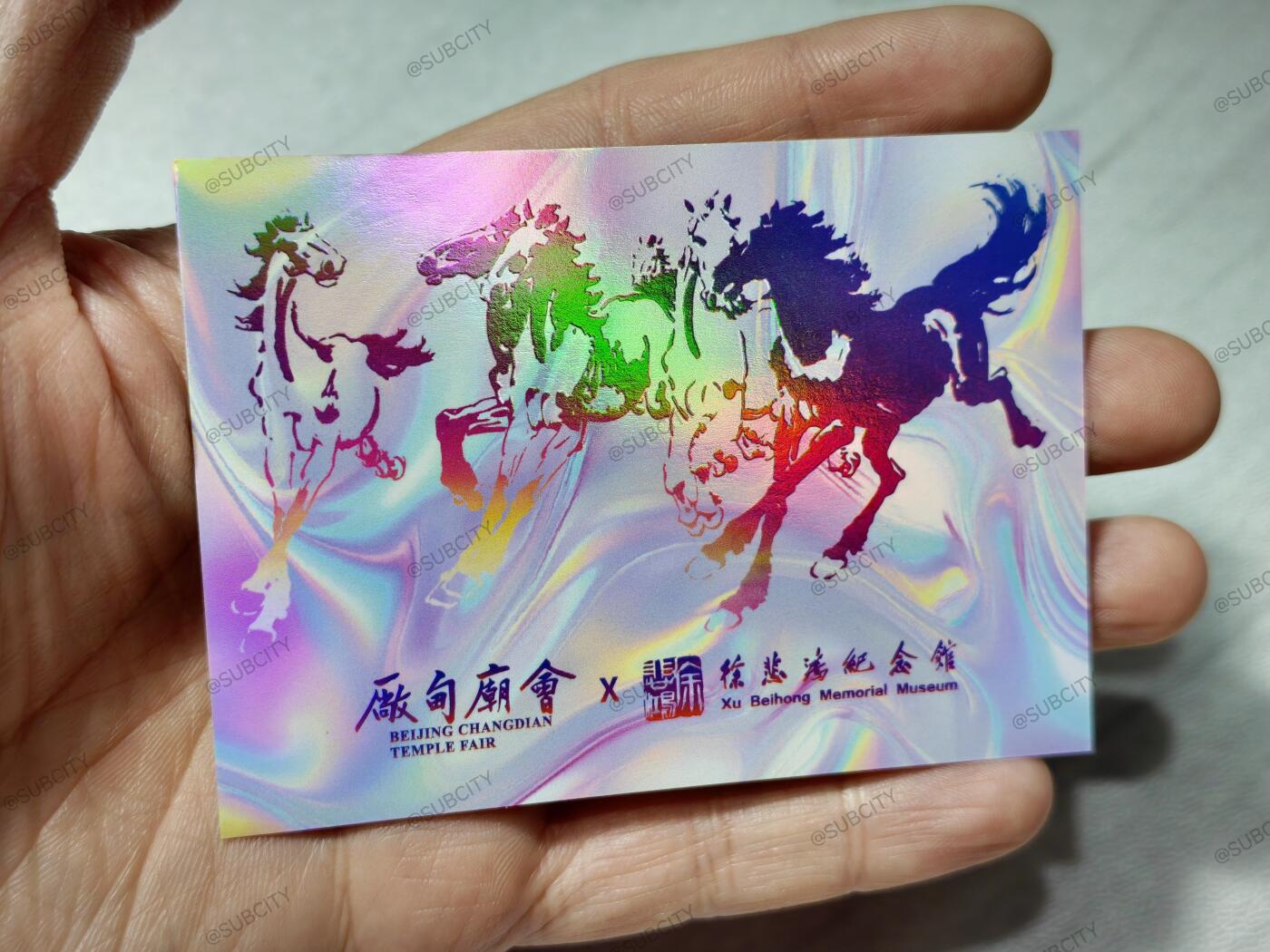 丙午马年逛厂甸庙会,怎能错过徐悲鸿纪念馆×厂甸庙会限定撕拉镭射纪念卡!初一初二跑断腿赶热闹,初三正好慢下来抽卡碰运气,把艺术年味带回家。这套联名卡一套共9款,含6款常规款+3款隐藏款,镭射工艺流光溢彩,印刻悲鸿笔下骏马神韵,兼具收藏与纪念价值。售卖点设在南新华街与琉璃厂街交叉口,东街街口、西街街口各一处,逛庙会随手就能冲。庙会非遗荟萃、大师画作同场亮相,边逛边抽卡,年味与艺术感拉满。祝大家欧气爆棚,轻松集齐隐藏款,马年开局就出彩!